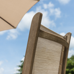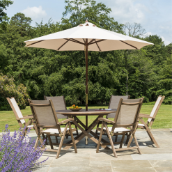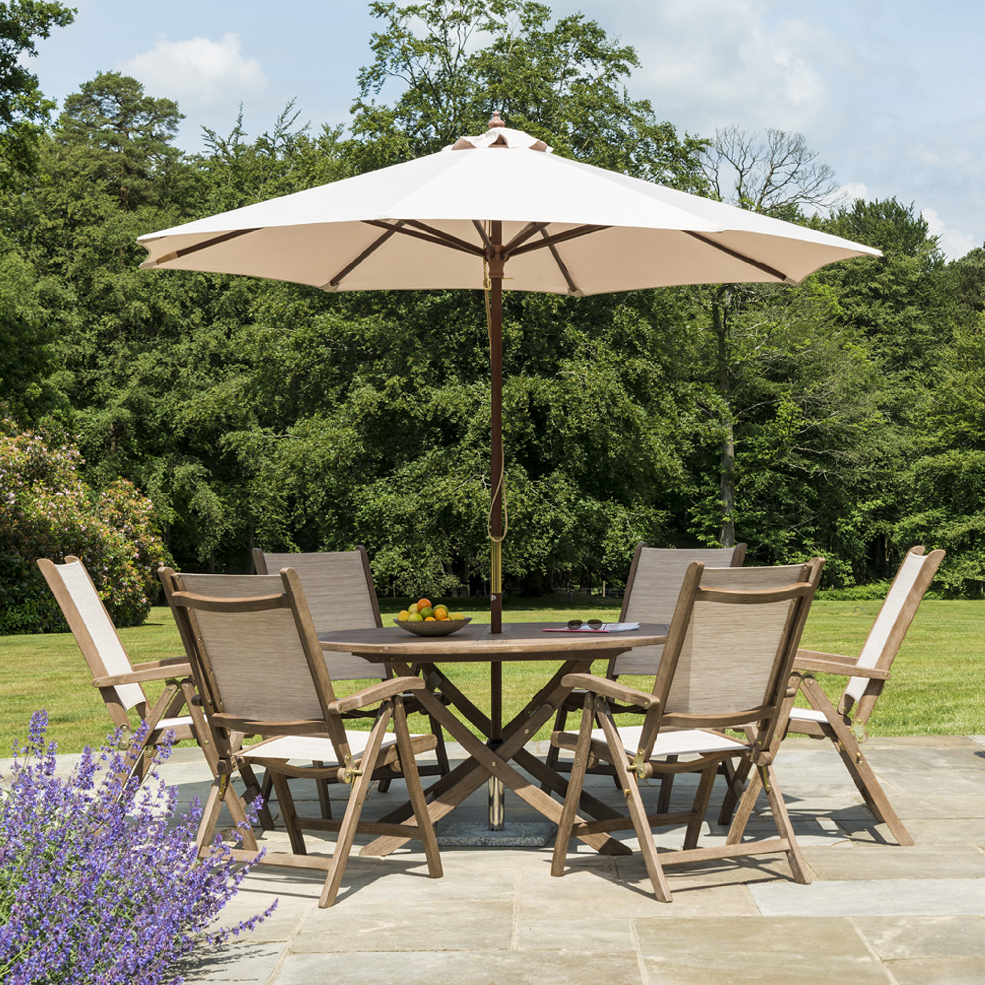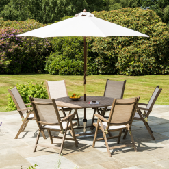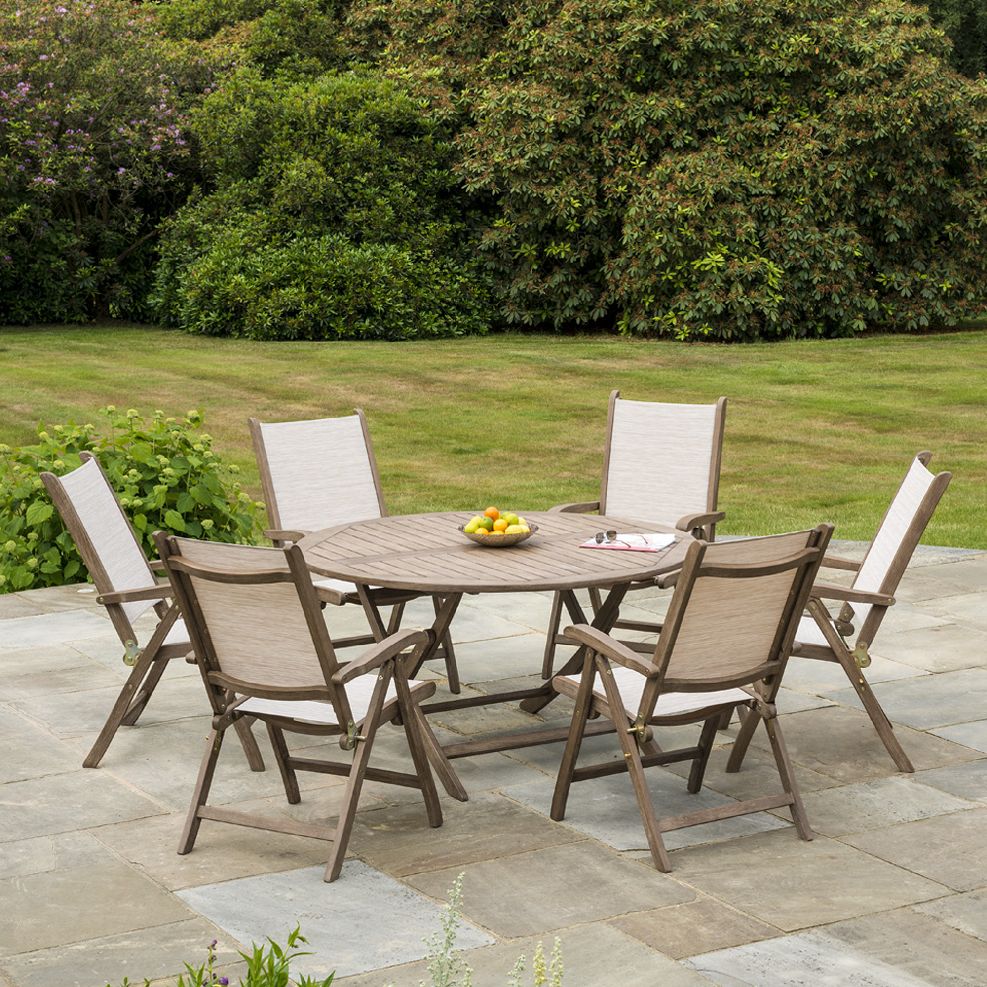 Our Acacia range is new for the 2022 season and is a modern twist on a traditional style of furniture. Exclusive for Rathwood in Ireland and UK mainland for 2022. The table diameter is 1.4m so comfortable for 6 people. The chair has arms for comfort and all pieces are folded for easy storage – the chair is finished with an oatmeal sling fabric for comfort so no cushion is required.