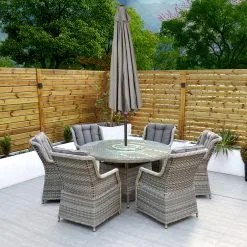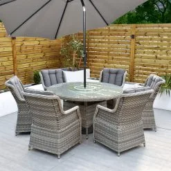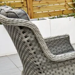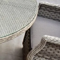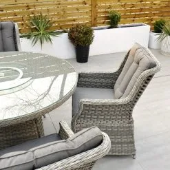 Like all Rathwood Furniture, the Bali Range is designed with the best all-weather rattan, crafted from a high-quality synthetic PPE material weave with varied textures and tones. All cushions are easy to clean and made exclusively of the highest quality UV-protected & weatherproof materials. The table top is 5mm clear tempered glass with a hole ready to take a parasol and stands on a 1.2mm thick aluminium frame finished with grey rattan detailing that matches the Bali chairs. The table requires a little simple and easy assembly whilst the chairs are supplied ready to sit on. The set is covered by a 5-year structural guarantee but please note this does not cover the glass top.