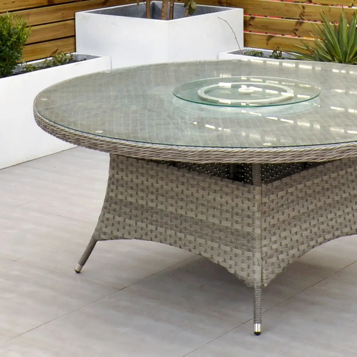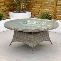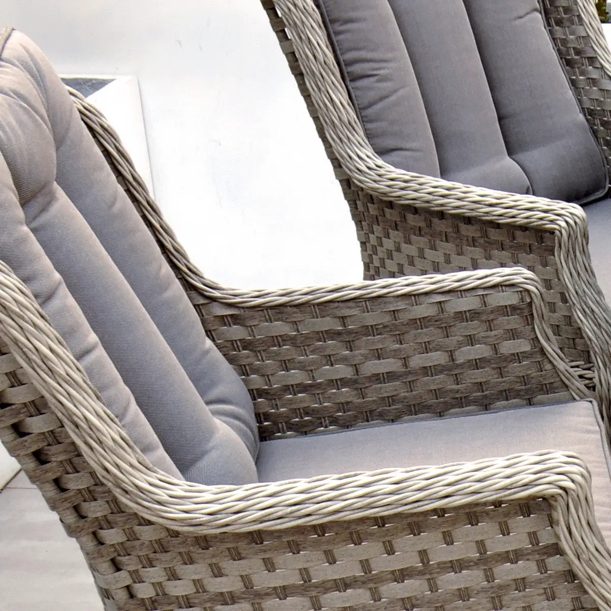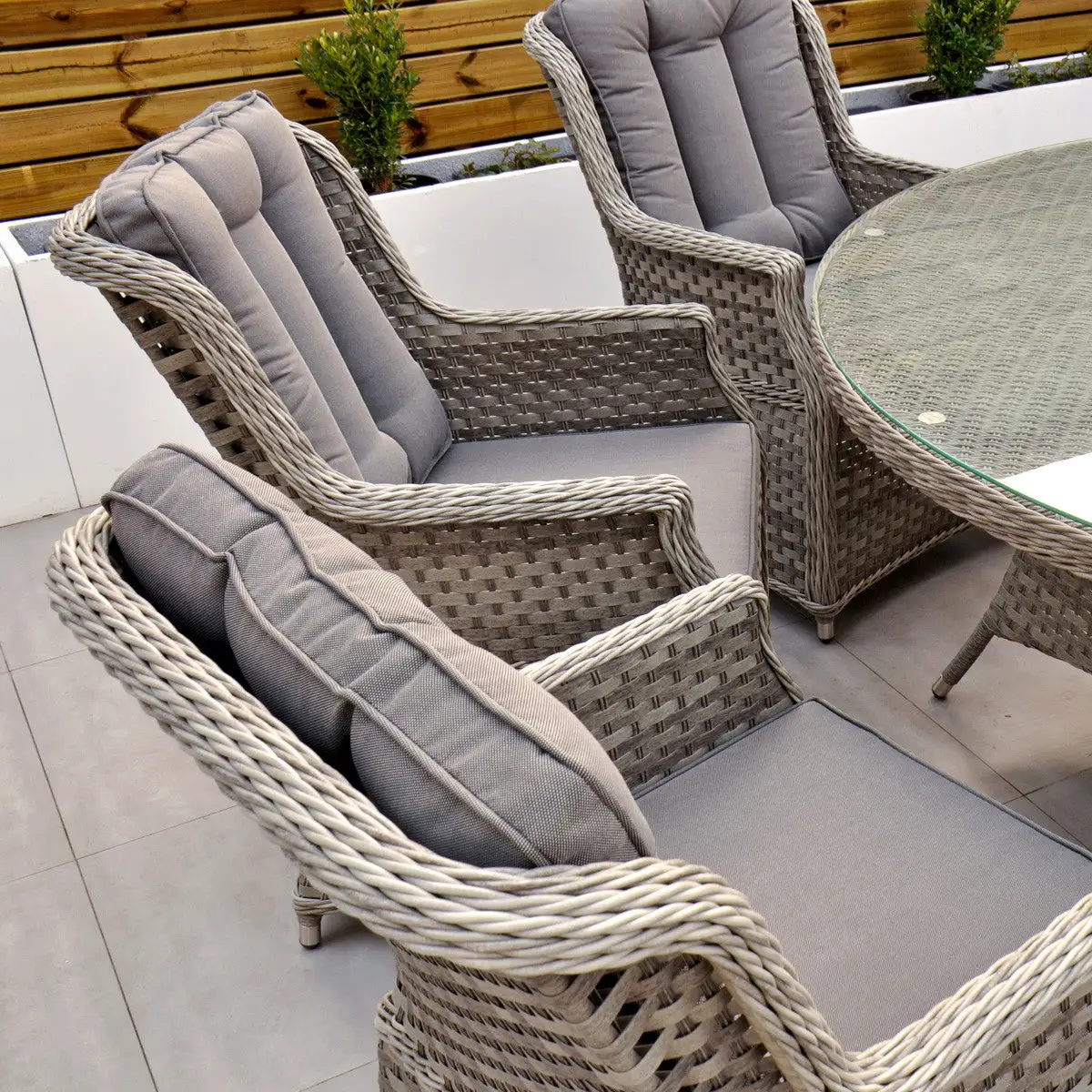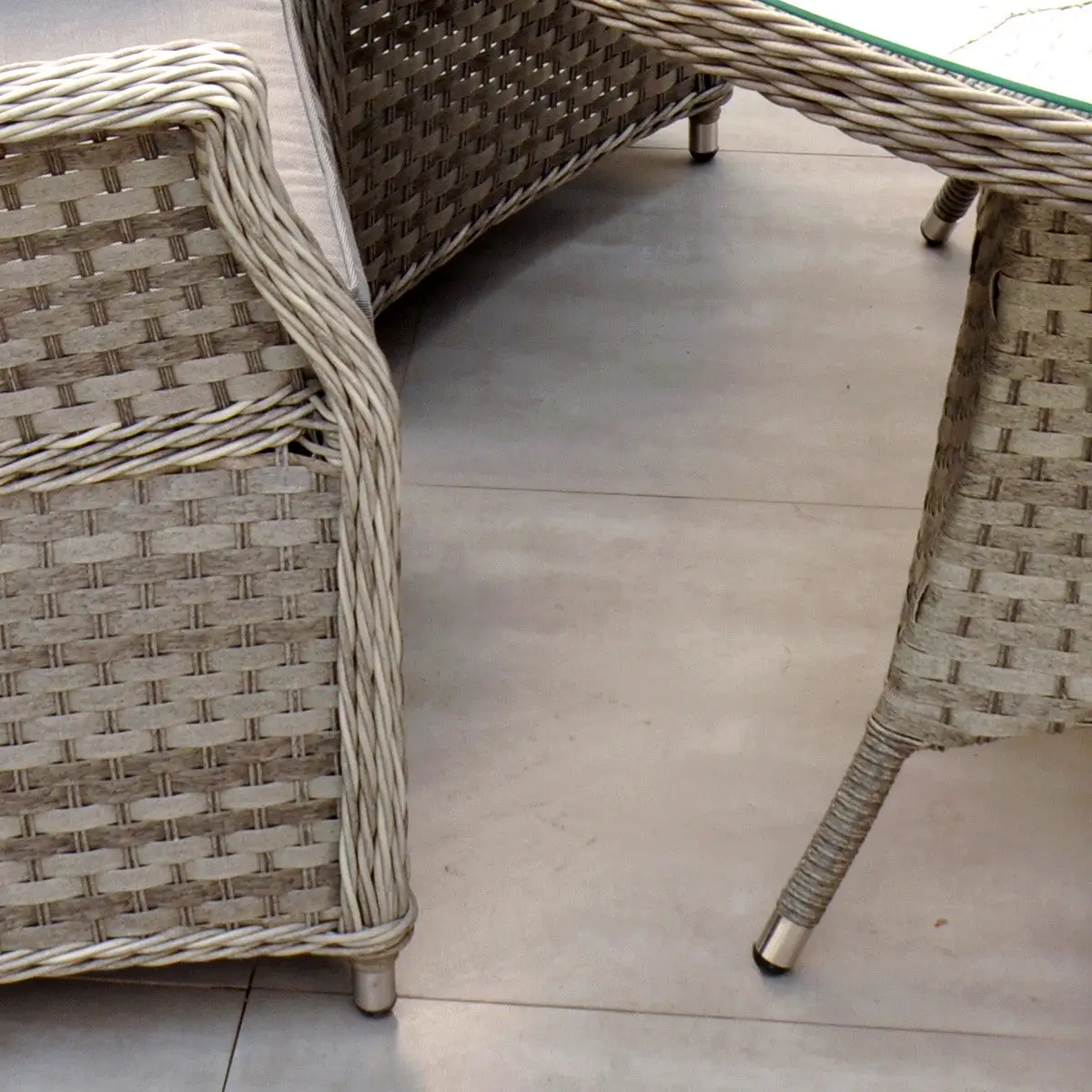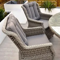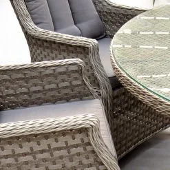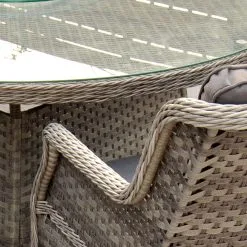 Like all Rathwood Furniture, the Bali Range is designed with luxury all-weather rattan, crafted from a high-quality PPE material weave with varied textures and tones. All cushions are machine washable and made exclusively of the highest quality UV-protected & weatherproof materials. The table top is 5mm clear tempered glass with a hole ready to take a parasol and stands on a 1.2mm thick aluminium frame finished with grey rattan detailing that matches the Bali chairs. The table requires a little simple and easy assembly whilst the chairs are supplied ready to sit on. The set is covered by a 5-year structural guarantee but please note this does not cover the glass top.