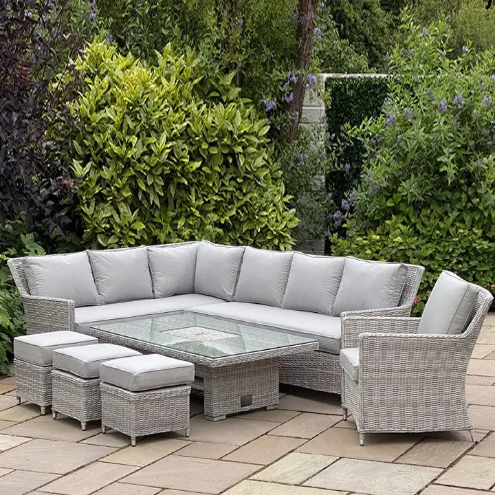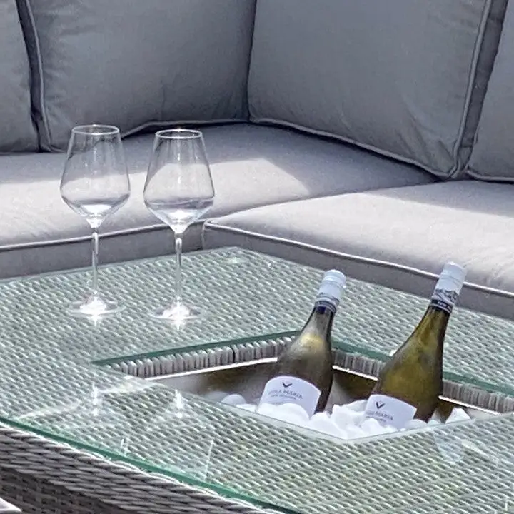 This might be the ultimate corner set for outdoor dining or just relaxing with friends and family for a casual drink. Firstly, the rectangular table is height adjustable, lift it up as a dining table or lower it for coffee cups and glasses. Secondly, the corner sofa provides ample space to seat 6 and the footstools when not used as such, provide extra seating, one must not forget the armchair and all of this comes with soft and comfortable cushions. Plus the table has an ice bucket in the centre to ensure your drink of preference is always cold (unless it’s tea that is!)