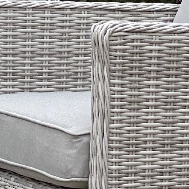 Like all Rathwood Furniture, it’s designed with the best all-weather rattan, crafted from a high-quality synthetic PPE material weave with varied textures and tones woven around 1.4mm thick cast aluminium frames meaning this set will not rust and is fine to be left outdoors. The table top is made of 5mm tempered glass for safety. All cushions are easy to clean and made exclusively of the highest quality UV-protected & weatherproof materials. There is little to no maintenance on this set making it the perfect addition to your home!