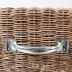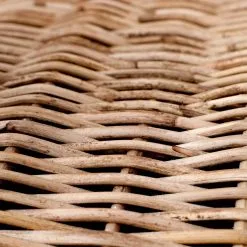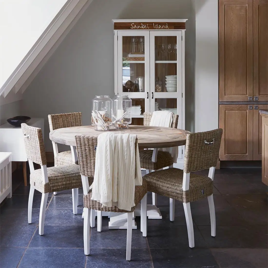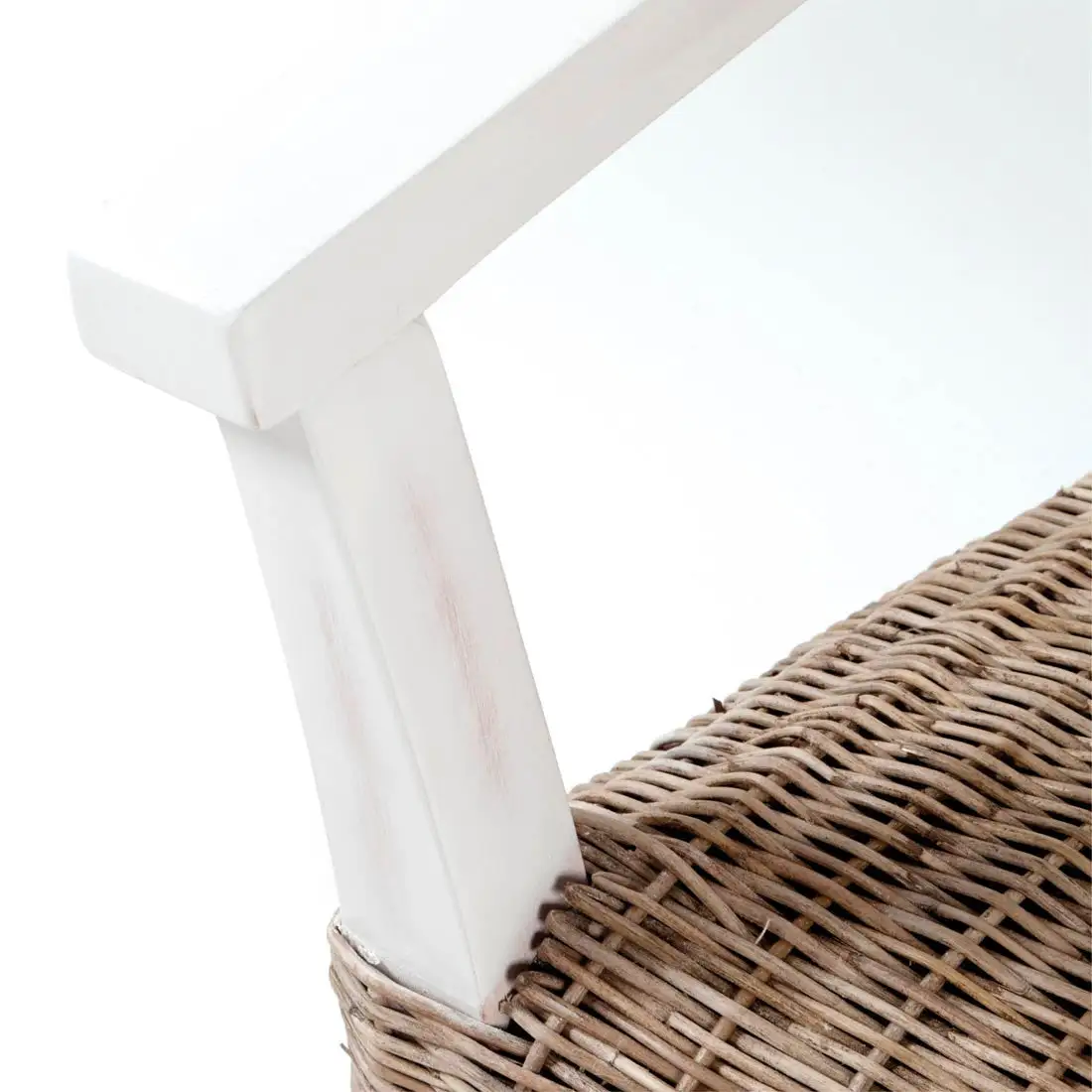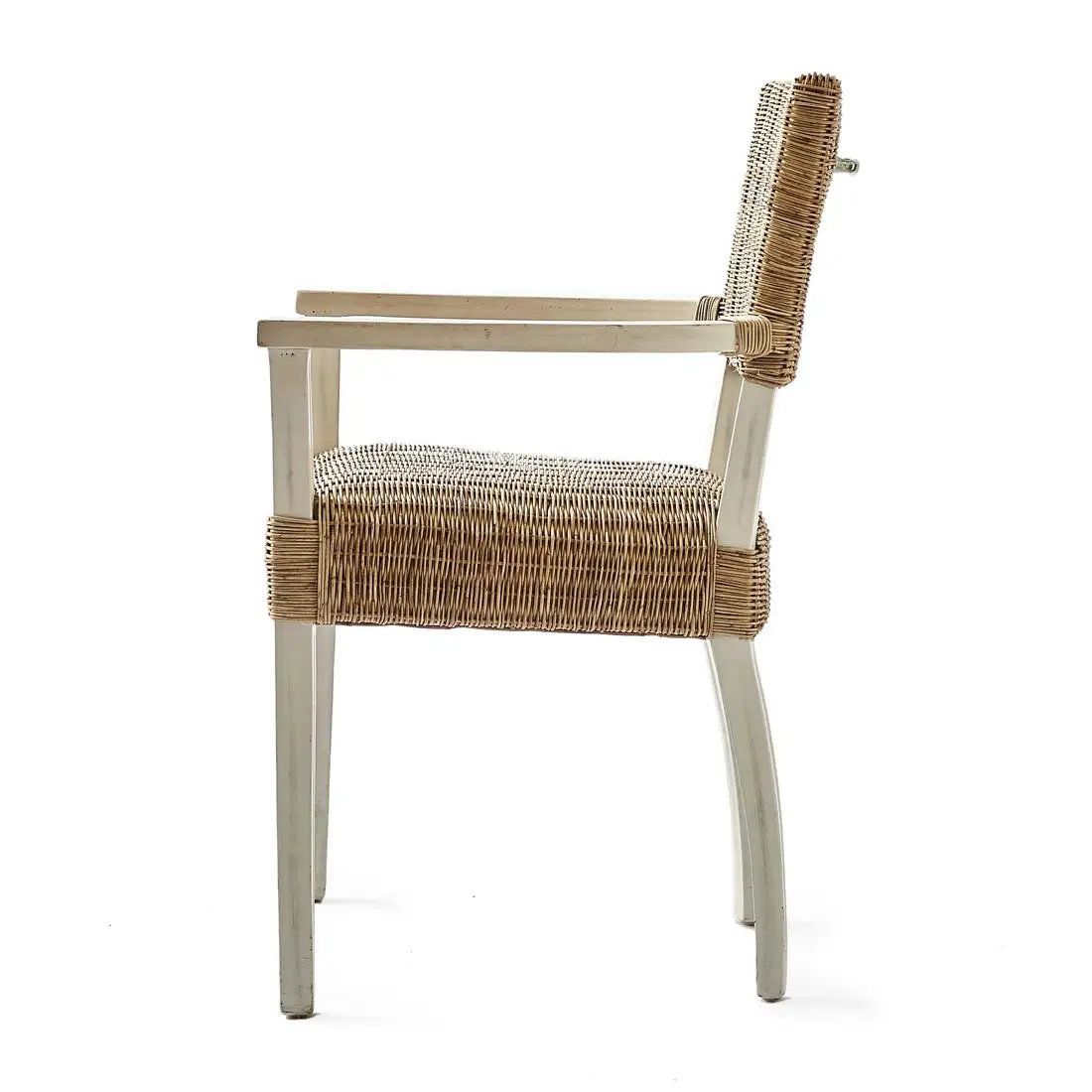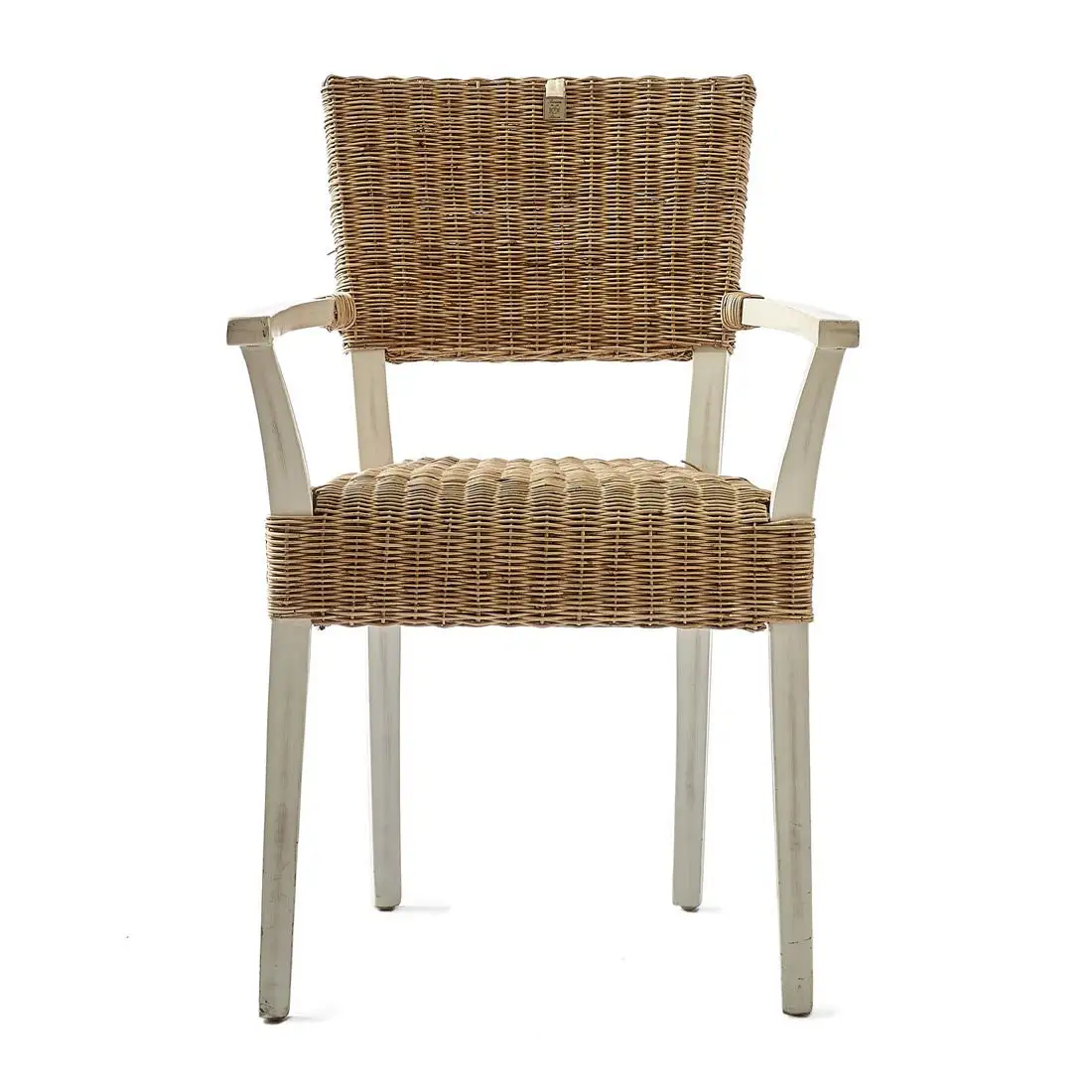 Dining chair with arm rests made from rattan, with a white-painted mahogany frame.