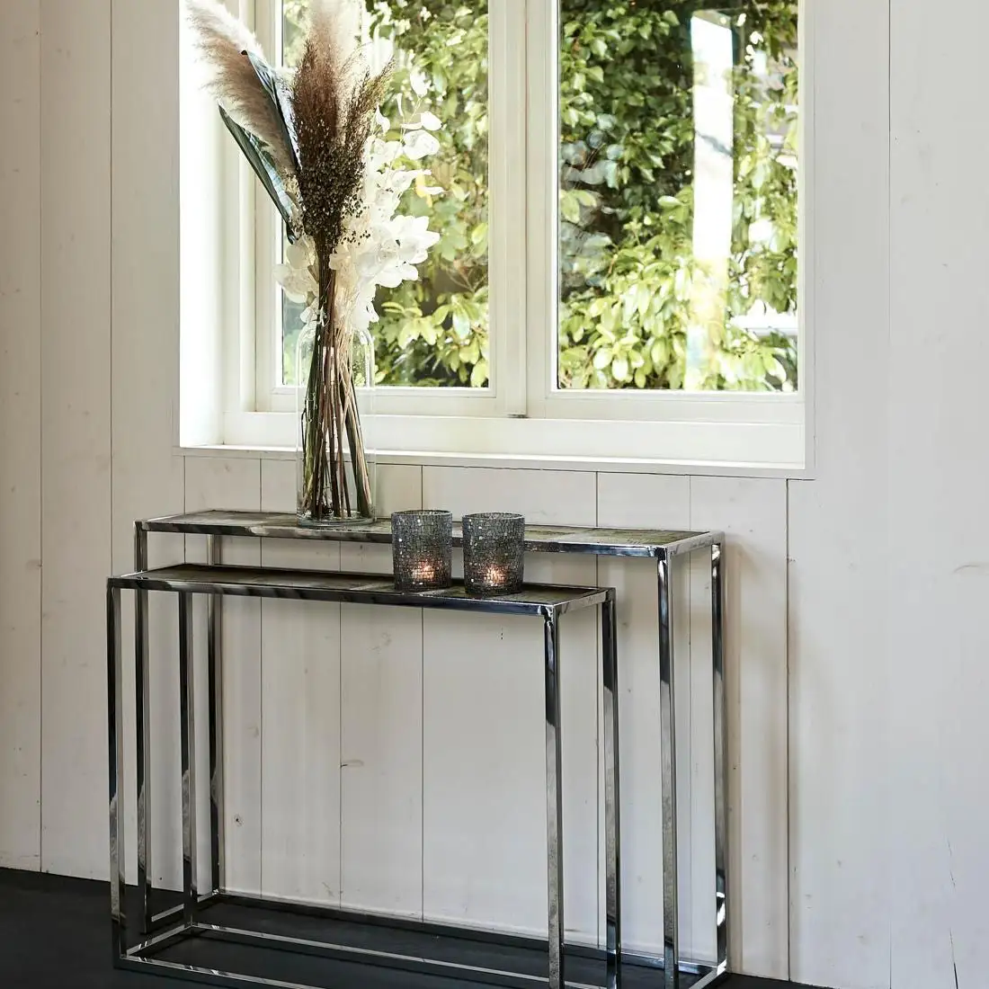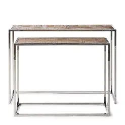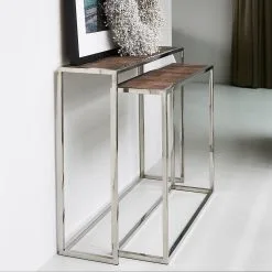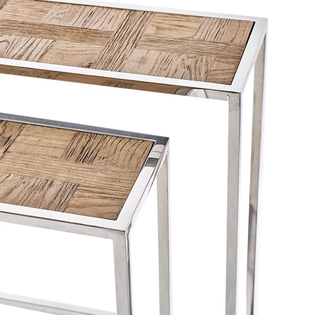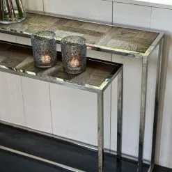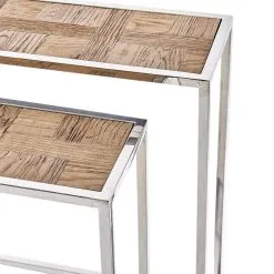 Rivièra Maison loves… the Bleeckerstreet series. The two side-table set flawlessly matches the exceptional characteristics of other furniture in the series. These refined tables of stainless steel and old oak are 90 and 110 centimetres long, 25 centimetres wide and 70 and 78 centimetres high.