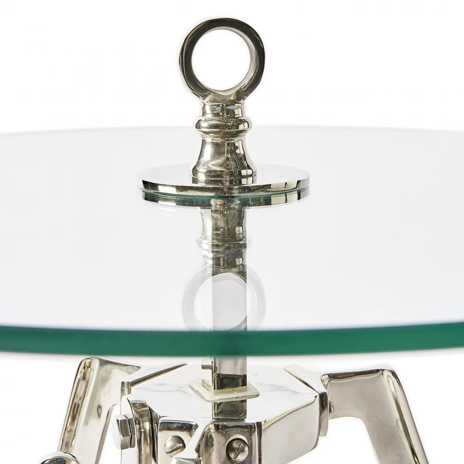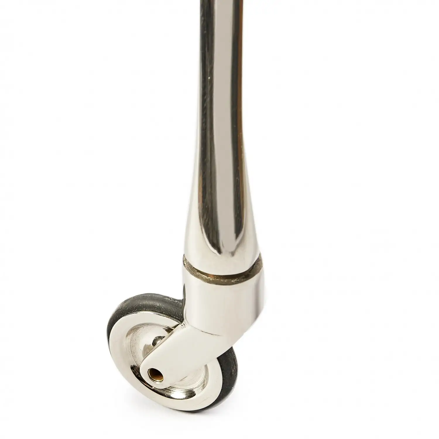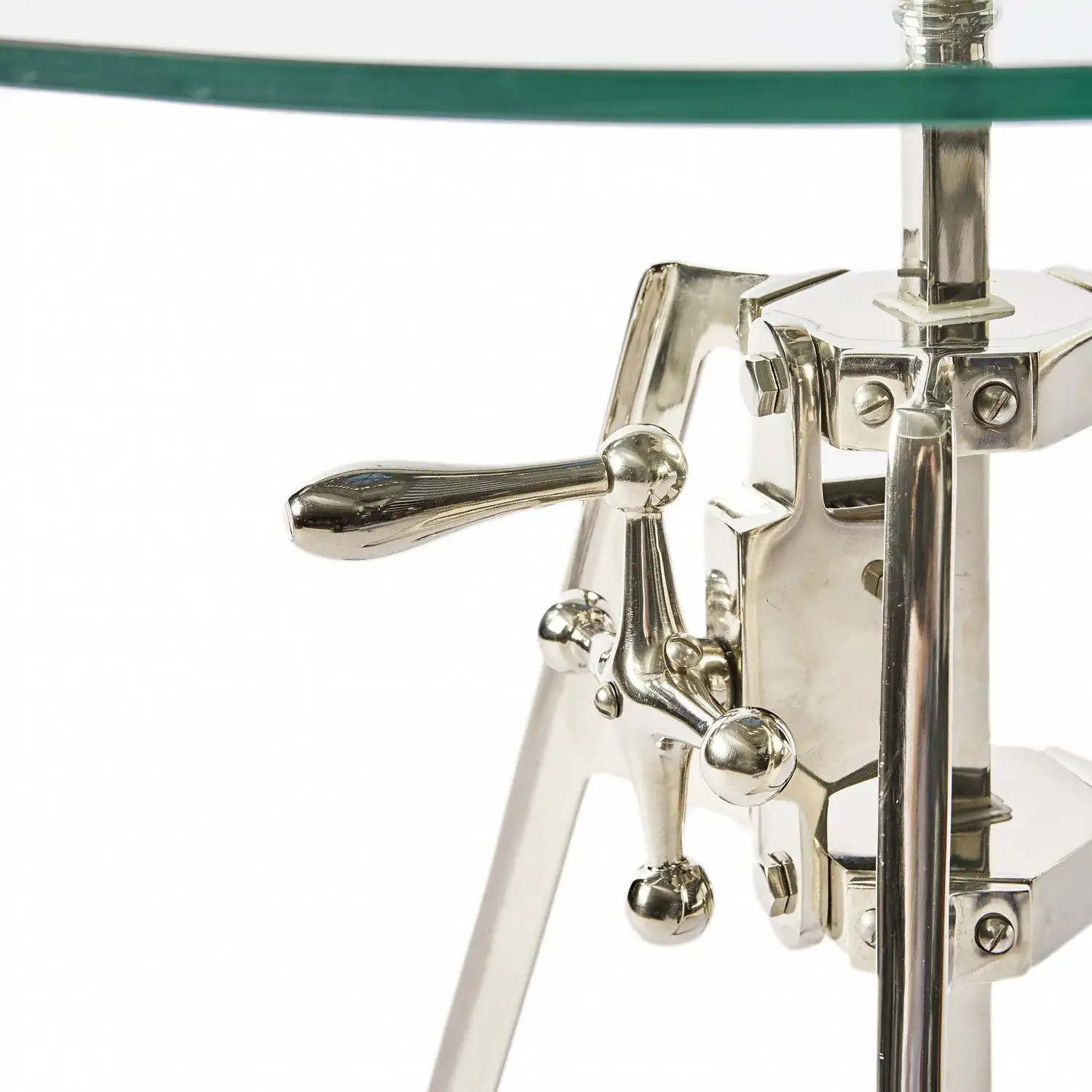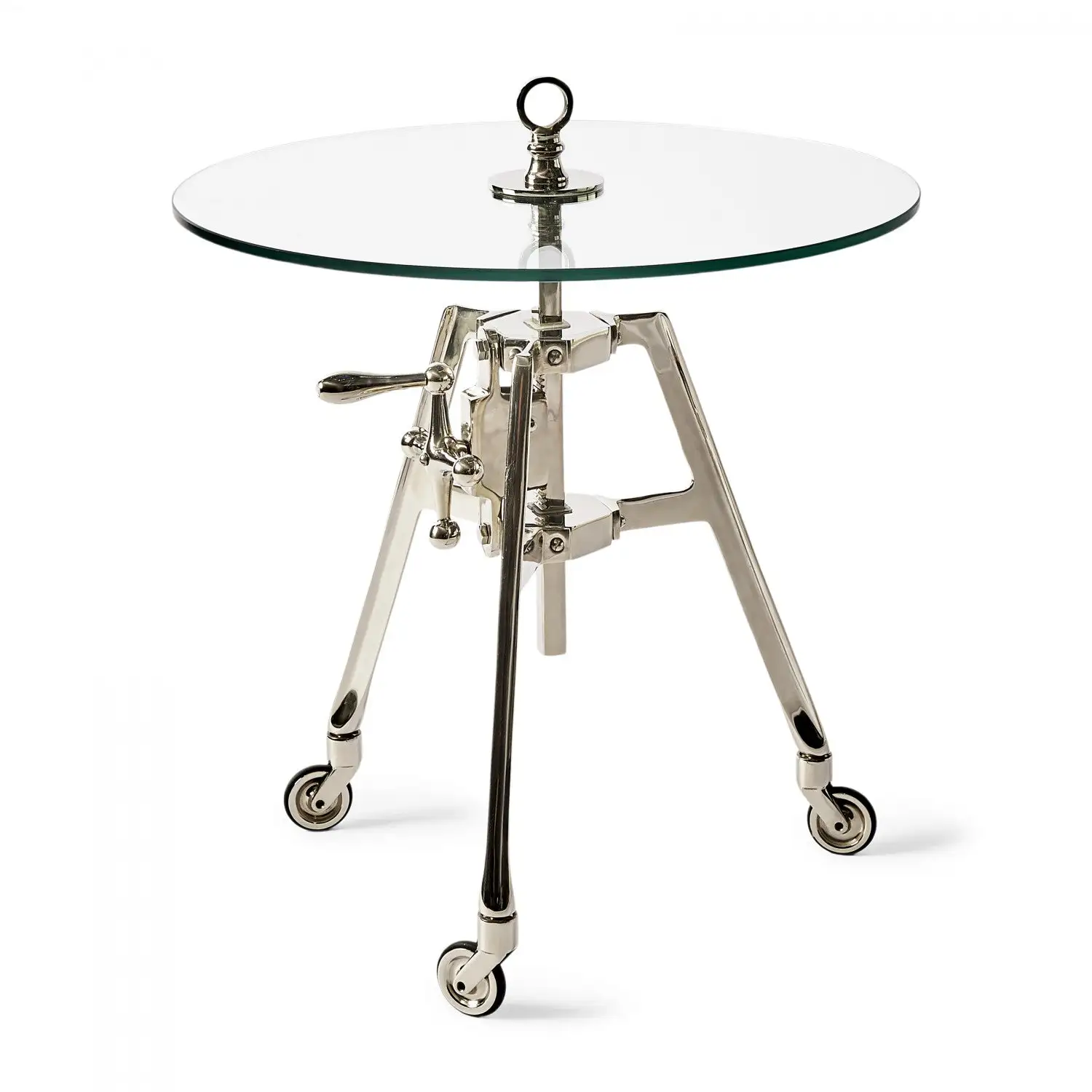 Everything about this beautiful side table is round, or at least rotatable. By turning an aluminium mechanism, the glass table-top adjusts its own height upwards and with the convenient castors, the table can simply be pushed to the right spot. Take a close look at the shiny aluminium of the leg, and notice it’s almost robotic features.