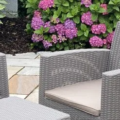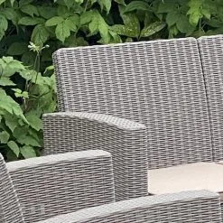 Both armchairs and the 2-seater couch on this grey rattan set include cream-coloured seat cushions making it a perfect match.
