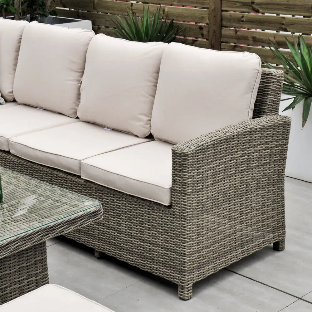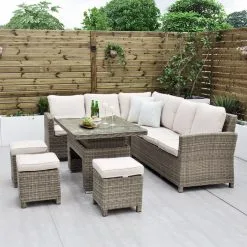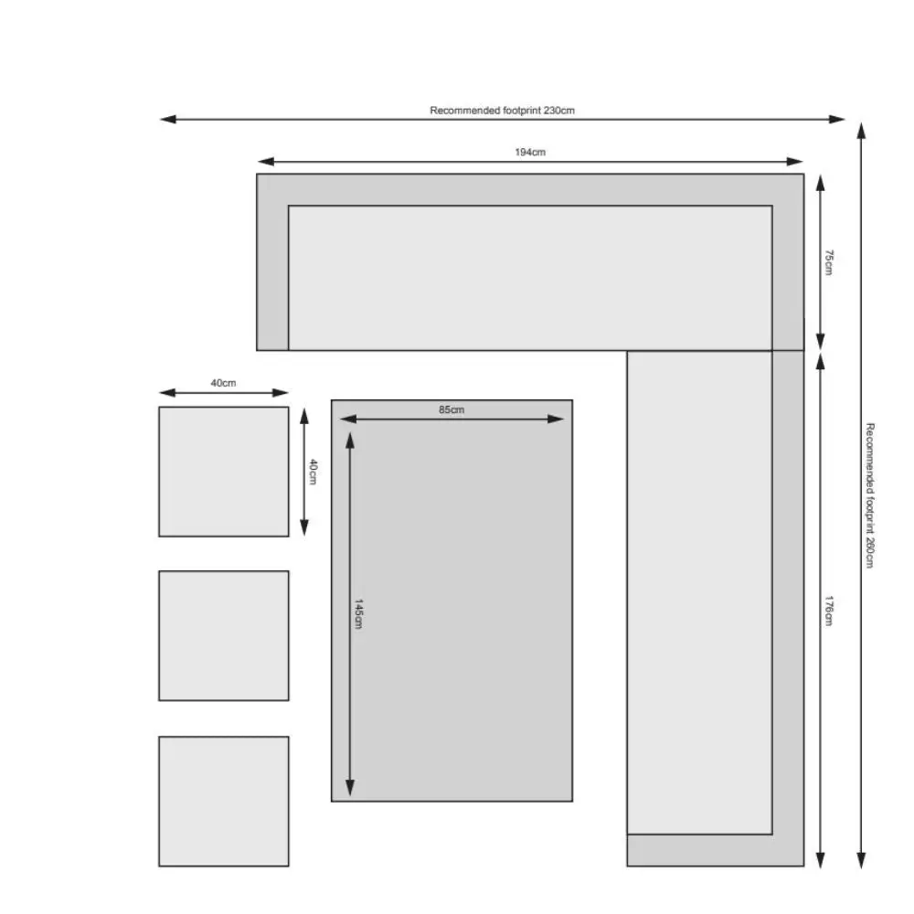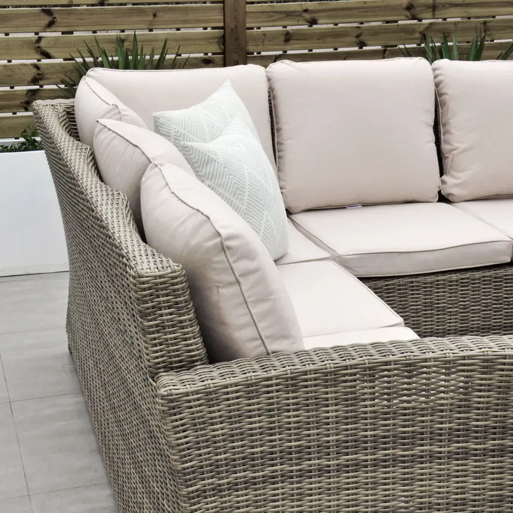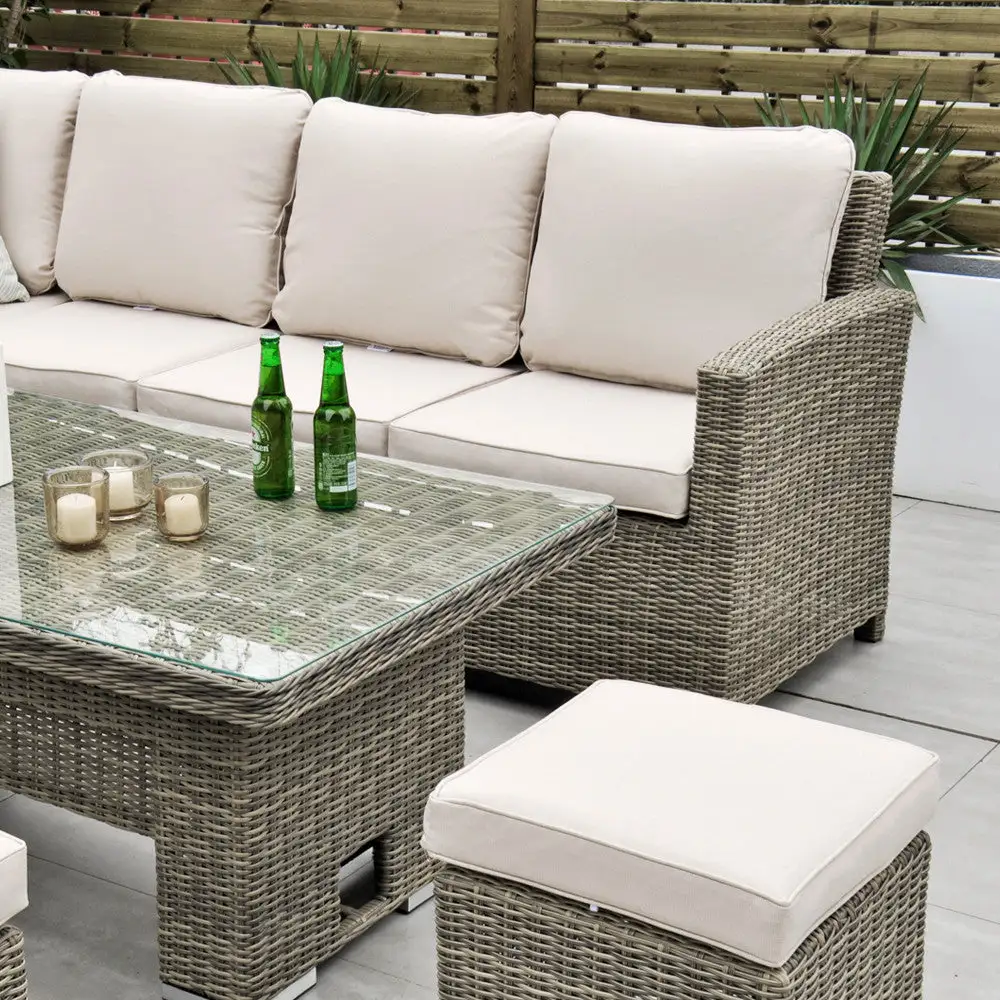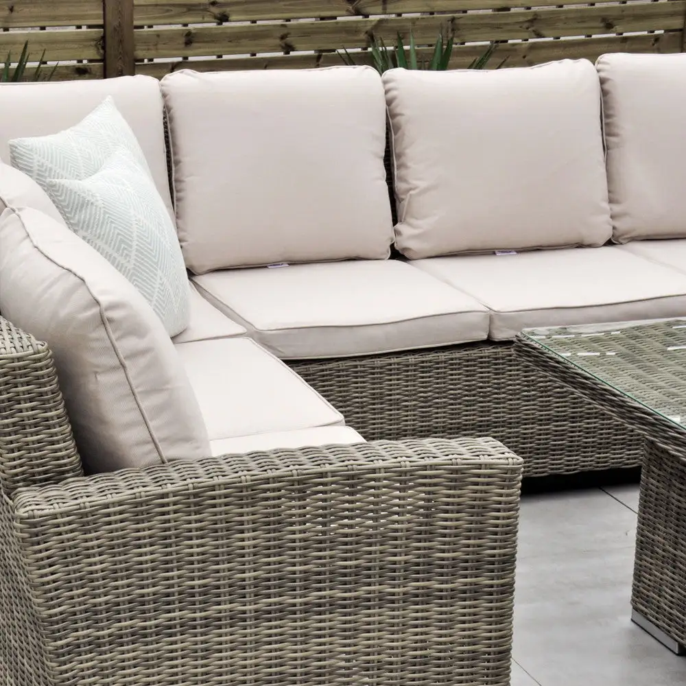 The Chester Corner Set is perfect for relaxing with a cup of coffee or enjoying a meal. There is lots of seating room for you and your family with 3 ottomans as well as the corner sofa itself. This would be stunning on any decking or patio area. Made from the highest grade of rattan and woven around a cast aluminium frame, this set will not rust and is fine to be left outdoors. There is little to no maintenance on this set making it the perfect addition to your home!