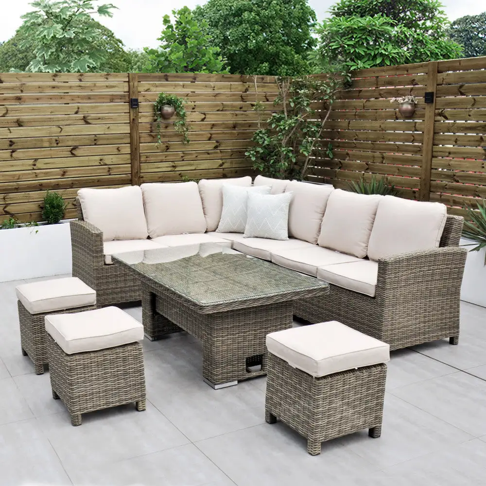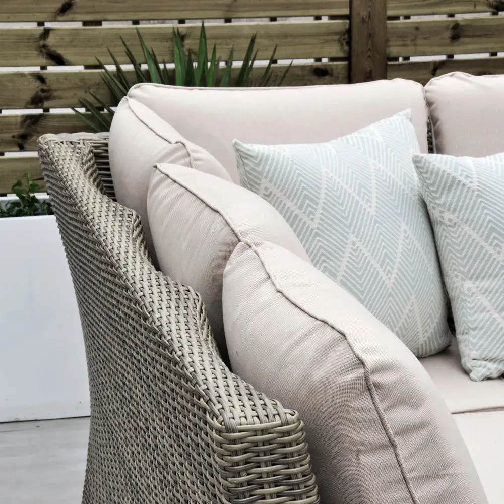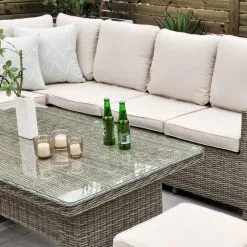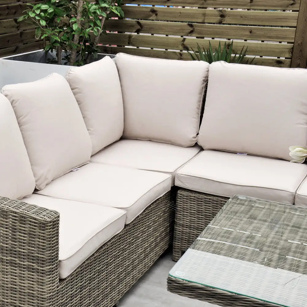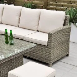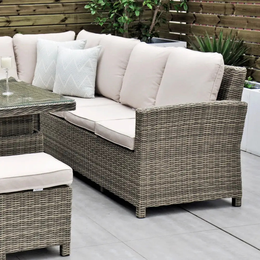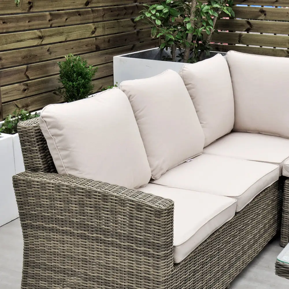 The Chester Corner Set is perfect for relaxing with a cup of coffee or enjoying a meal. There is lots of seating room for you and your family with 3 ottomans as well as the corner sofa itself. This would be stunning on any decking or patio area. Made from the highest grade of rattan and woven around a cast aluminium frame, this set will not rust and is fine to be left outdoors. There is little to no maintenance on this set making it the perfect addition to your home!