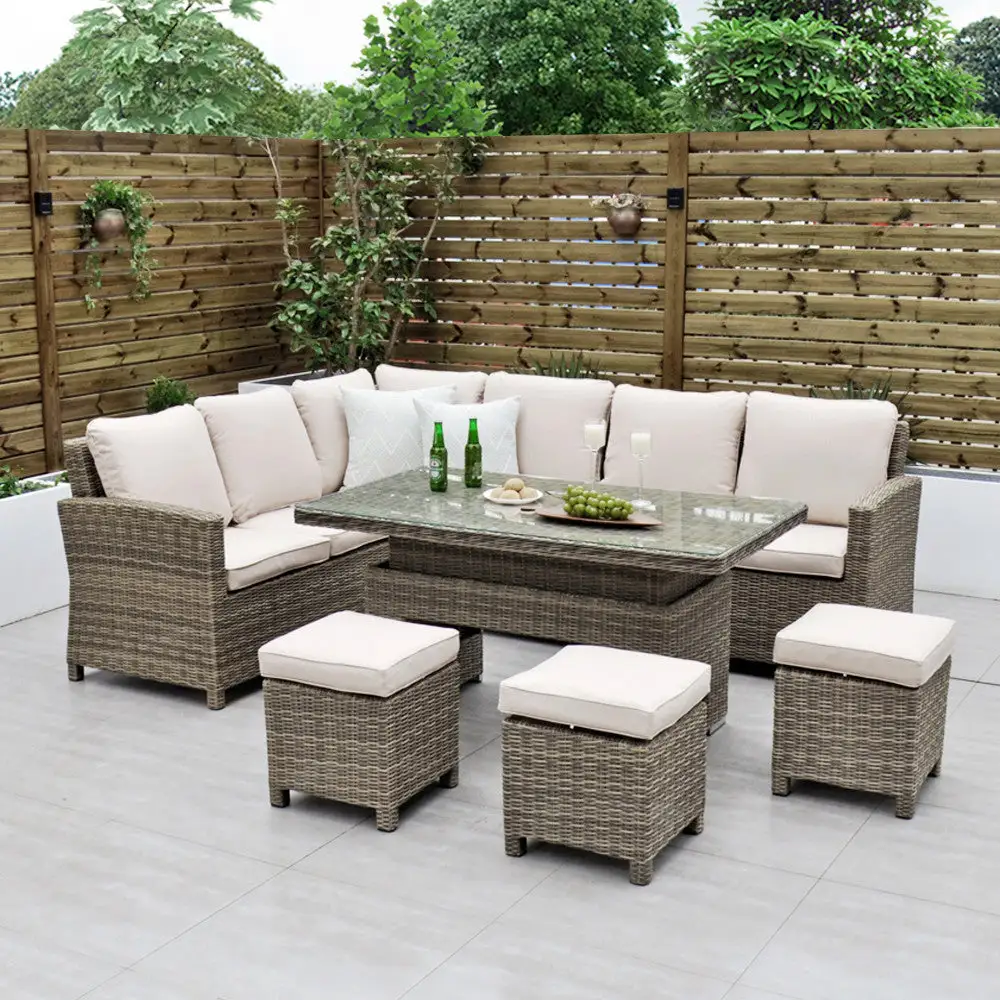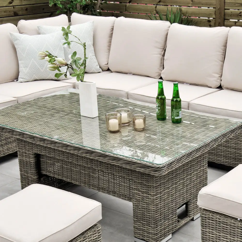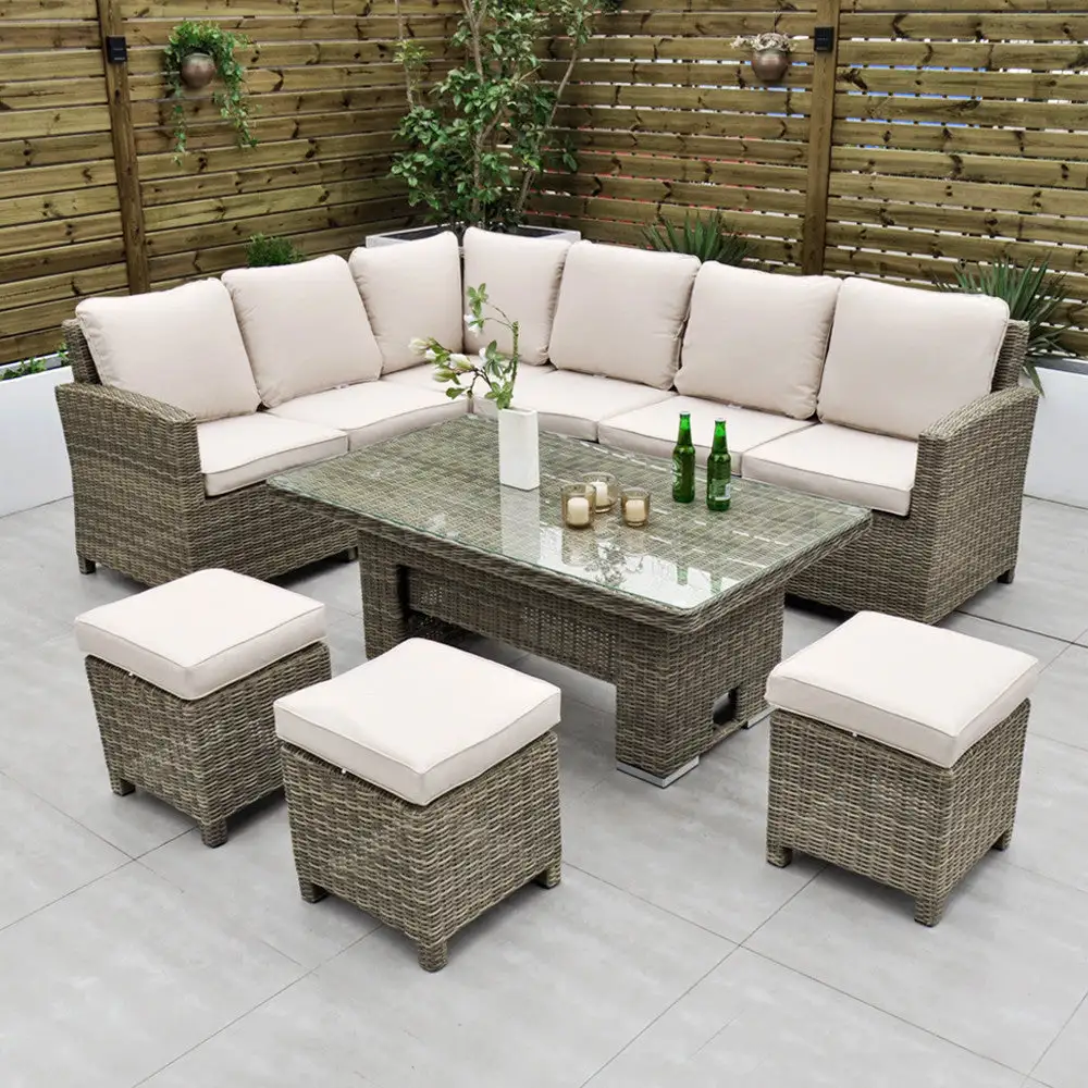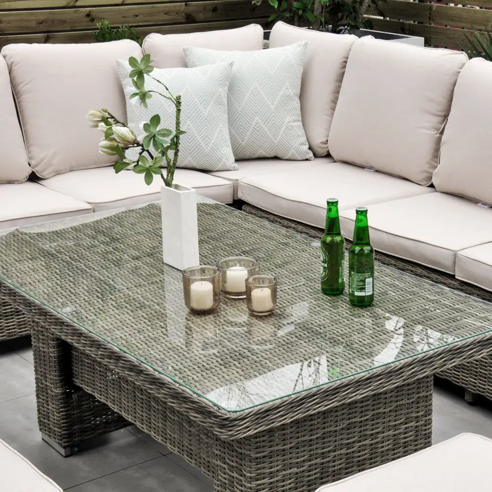 The Chester Corner Set is perfect for relaxing with a cup of coffee or enjoying a meal. There is lots of seating room for you and your family with 3 ottomans as well as the corner sofa itself. This would be stunning on any decking or patio area. Made from the highest grade of rattan and woven around a cast aluminium frame, this set will not rust and is fine to be left outdoors. There is little to no maintenance on this set making it the perfect addition to your home!