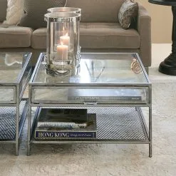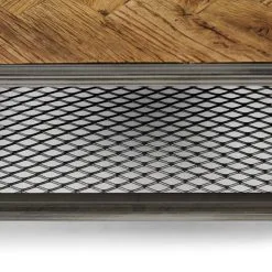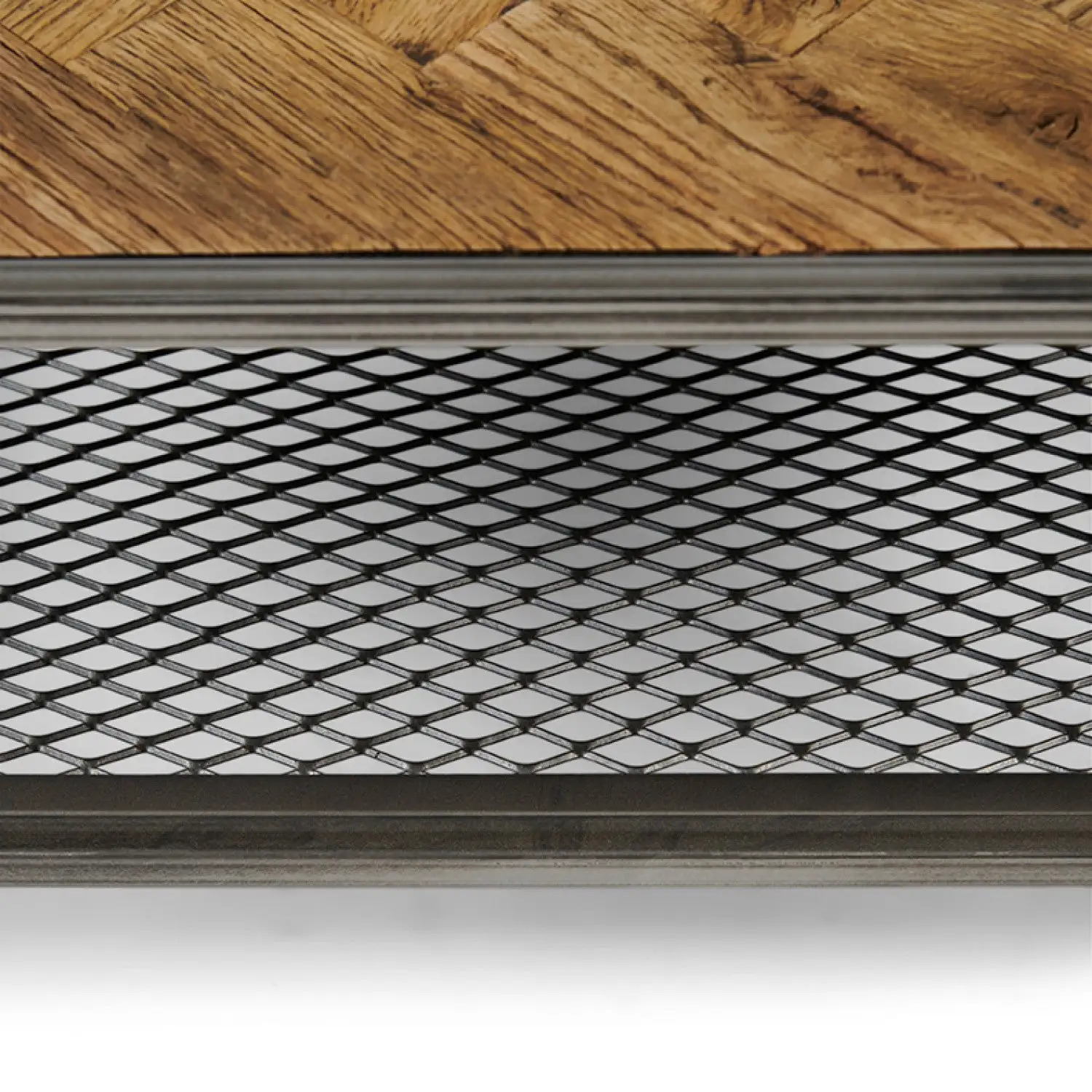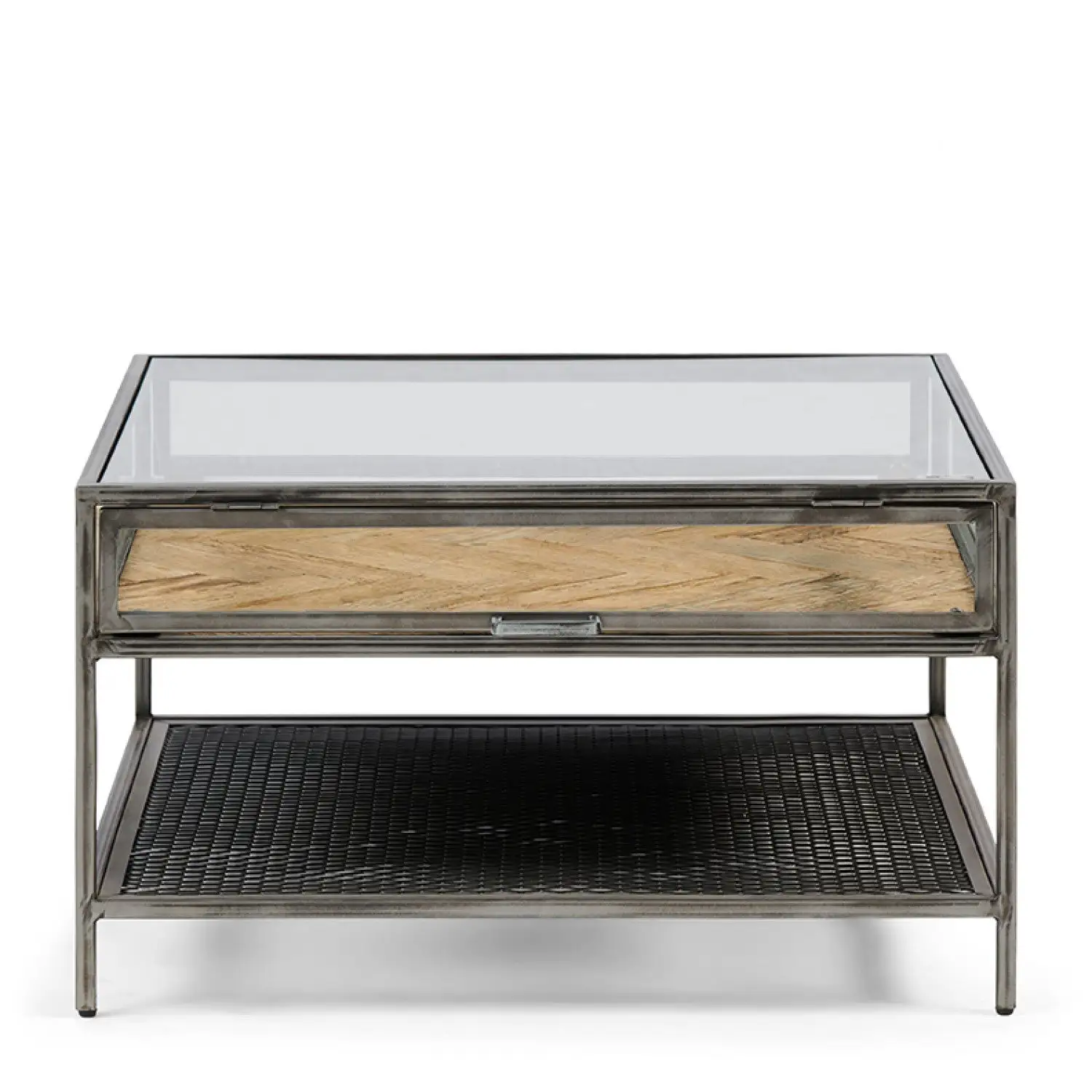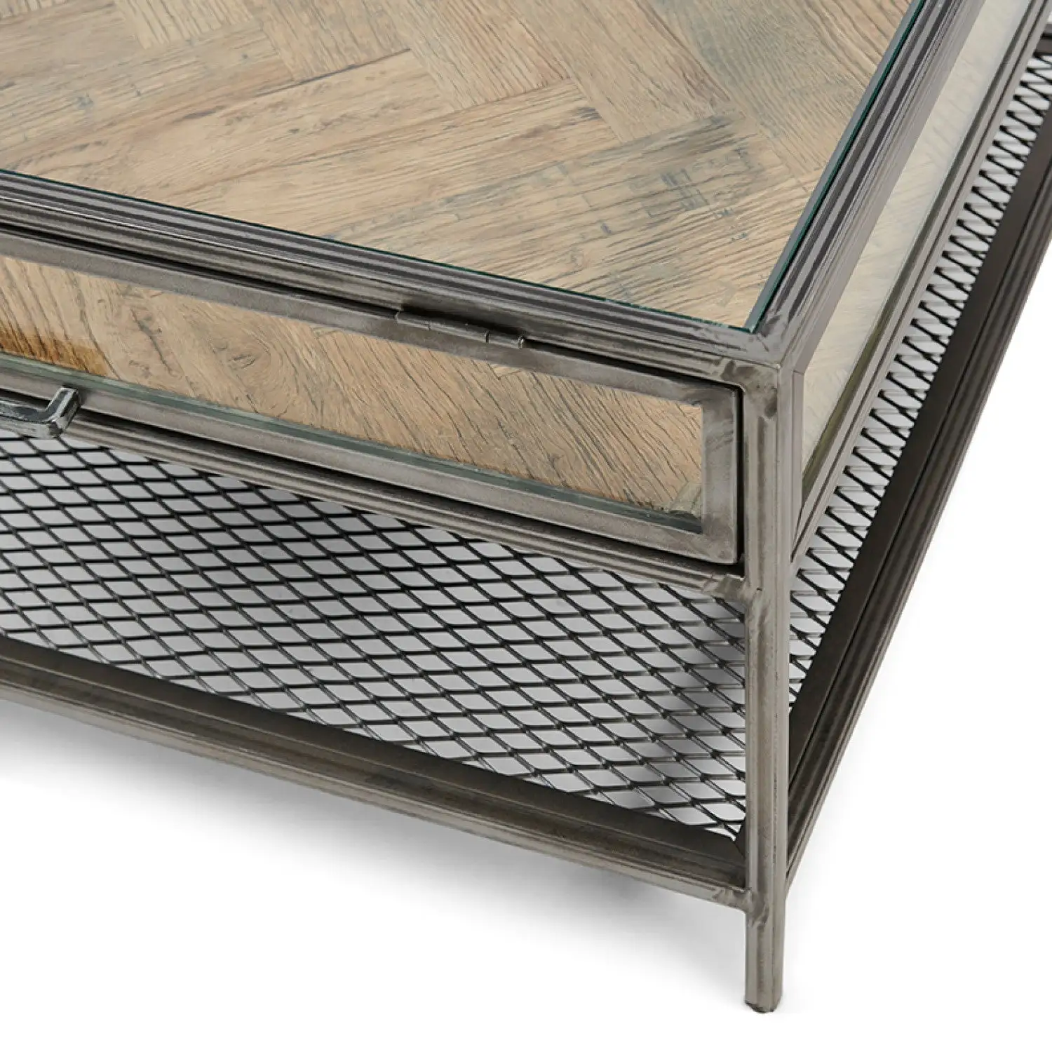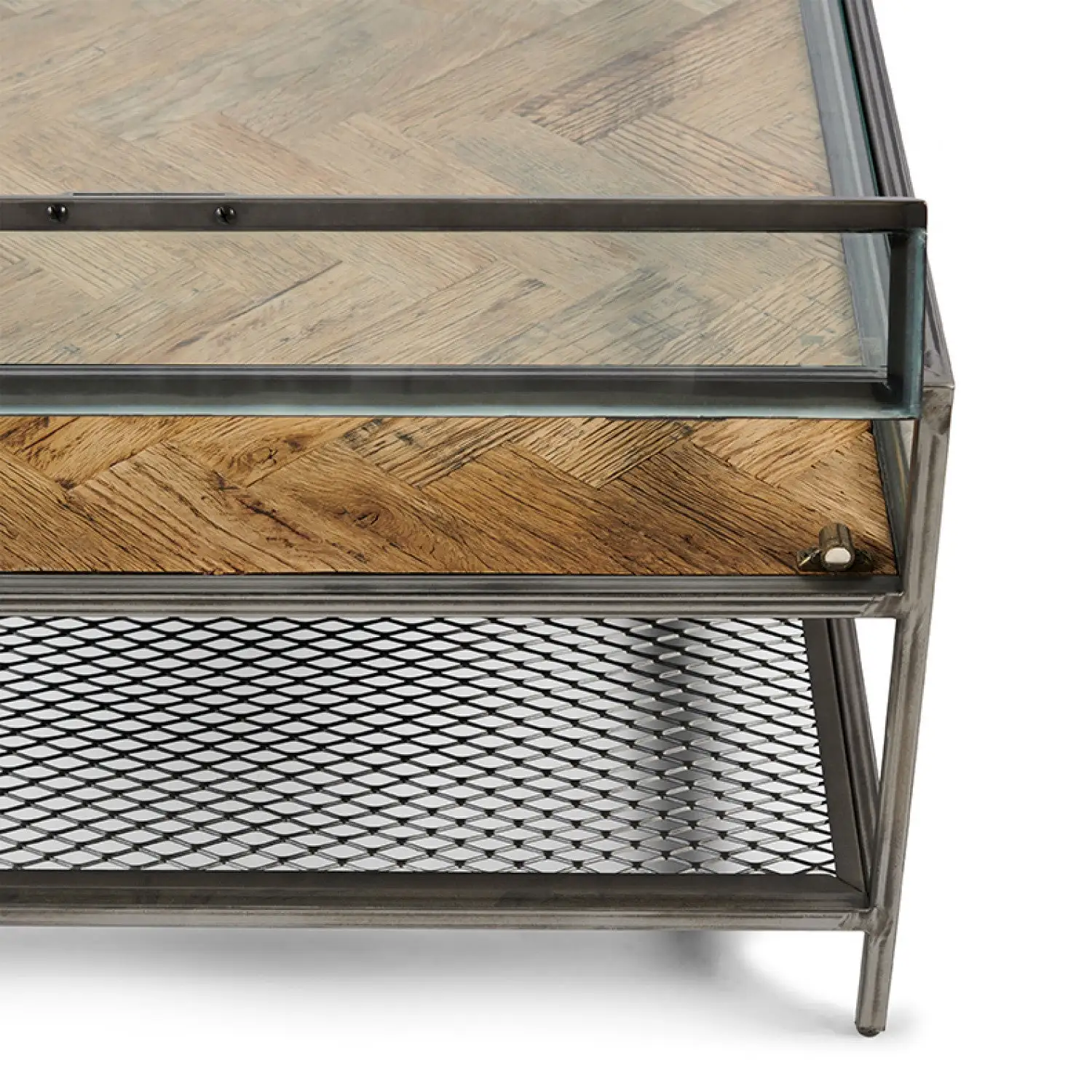 The top of this square coffee table is essentially a large glass box that opens at both ends, allowing you to display decorative items inside. There is a mesh storage shelf underneath the box. The table is made of glass, herringbone- patterned oak, and metal.