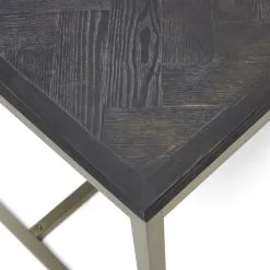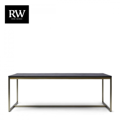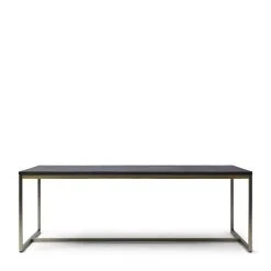 This Costa Mesta Ding Table is no less than 220 centimetres long and 90 centimetres wide: the largest variant of the series. The generous table is 78 centimetres high. A modern and industrial design, but with a warm, dark oak tabletop. The base is of gold-coloured metal.