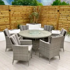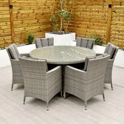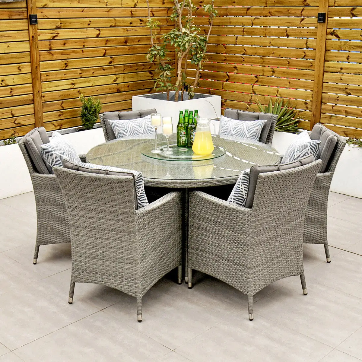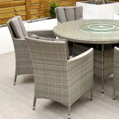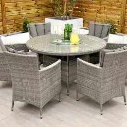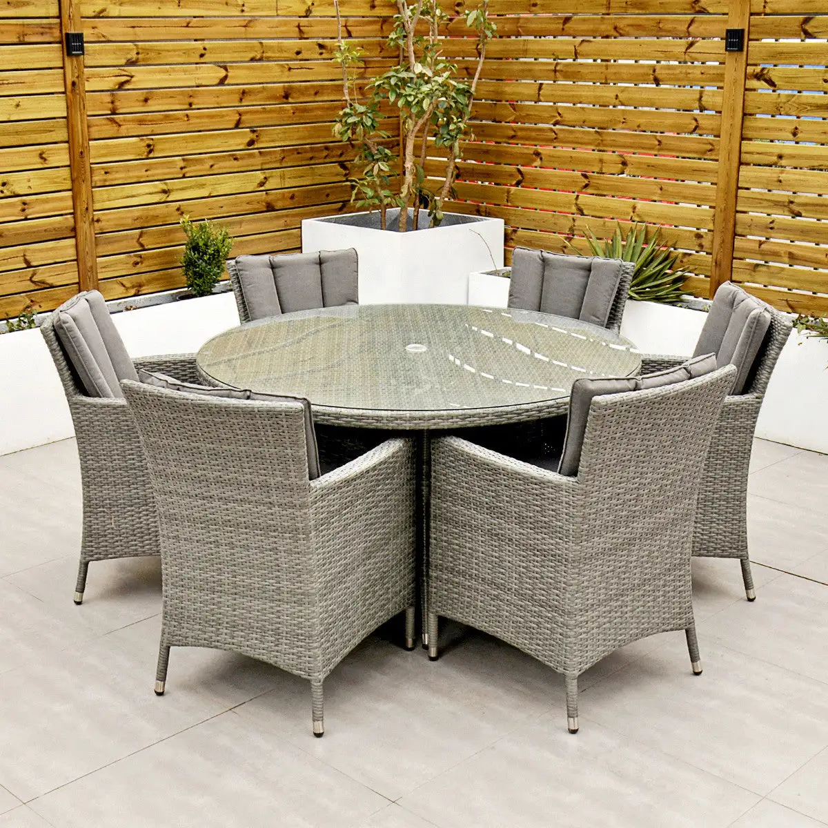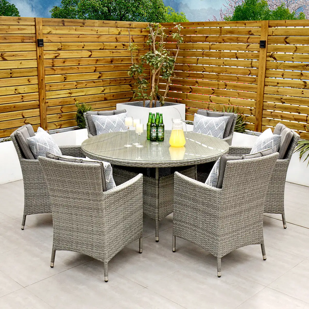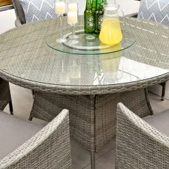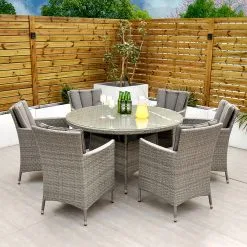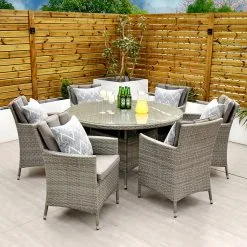 With seating for 6 people this stylish modern Cuba 6 Seat Dining Set makes no compromise on delivering a luxury outdoor dining experience and is ideal for entertaining and bringing the family together. Like all Rathwood Furniture, the Cuba range is designed with the best all-weather rattan, crafted from a high-quality synthetic weave with varied textures and tones woven around 1.4mm thick cast aluminium frames meaning this set will not rust and is fine to be left outdoors. The glass table top is made with 5mm tempered glass for safety. All cushions are easy to clean and made exclusively of the highest quality UV-protected & weatherproof materials. There is little to no maintenance on this set making it the perfect addition to your home! It comes with a 5-Year Structural Guarantee but please note the glass is not covered by the guarantee.