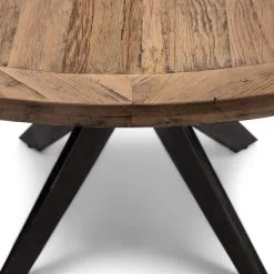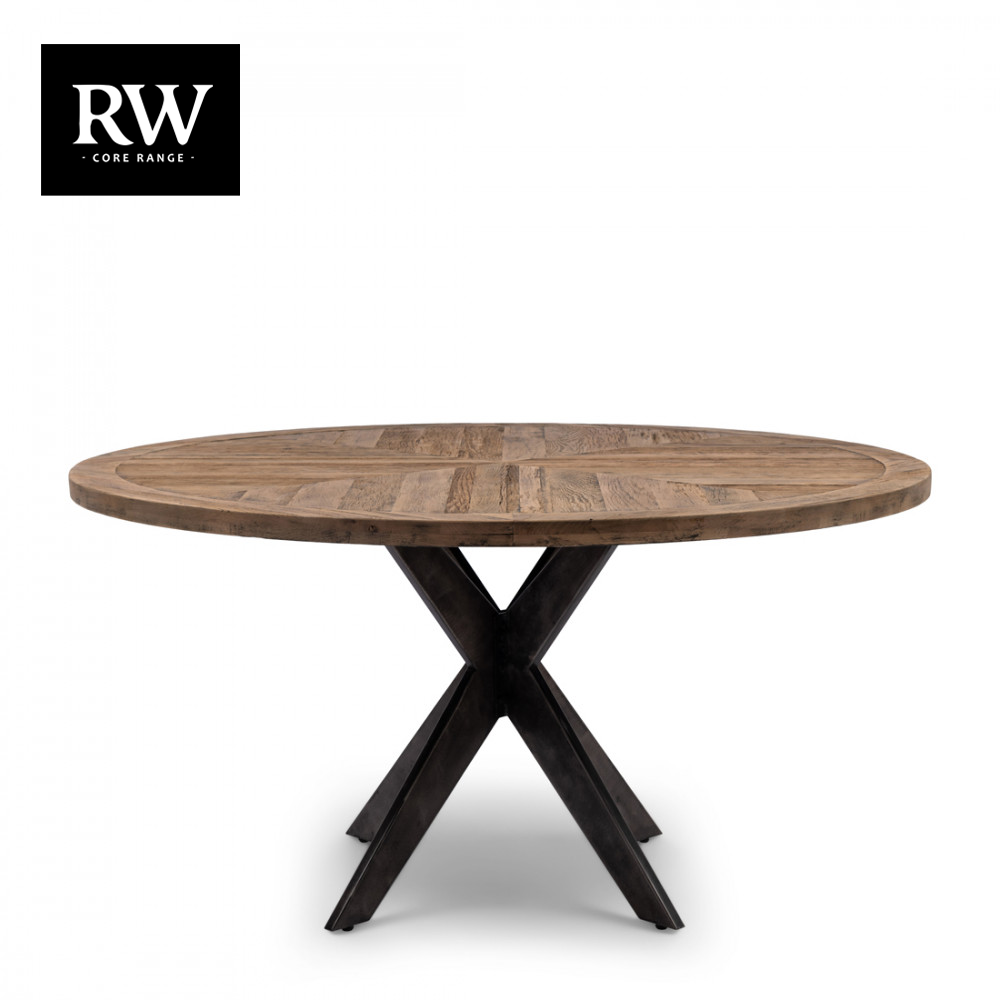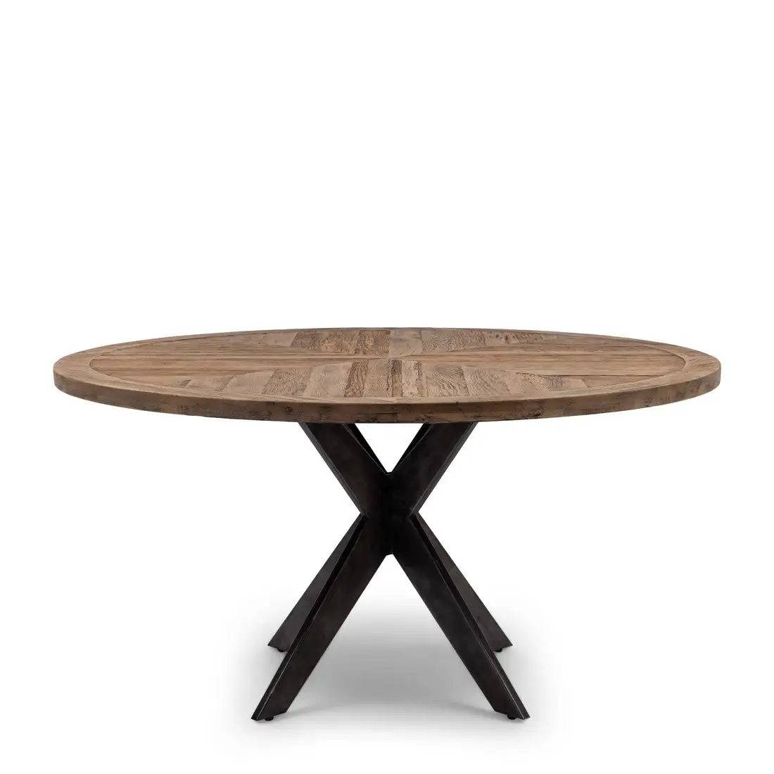 The Falcon Crest Dining Table is a beautiful round dining table with a diameter of 1.5 metres, the top made of inlaid recycled oak and being natural wood the colour and structure show a lot of variation and the cross shaped industrial frame is finished in matte black iron. This stable dining table also comes in a rectangular shape.
