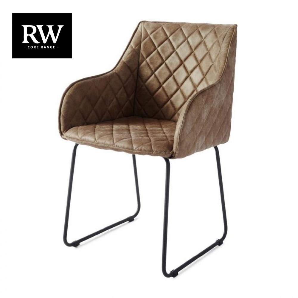 This dining chair can be called both classical and industrial. The iron frame gives the industrial look, despite the iron legs having a subtle design. The bucket seat is covered with Pellini leather, which is top-stitched in a diamond pattern, giving the impression that the entire chair is bedecked with tiny cushions.