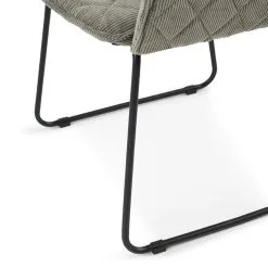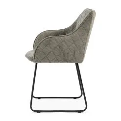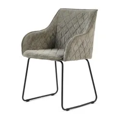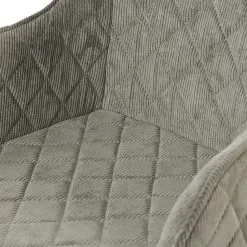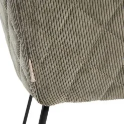 A slender chair with armrests. Its seat upholstery and filling are stitched in a diamond pattern, and the fabric is ribbed velvet, a classic choice with a carpetged twist. This dining chair is available in various fabrics and colours.