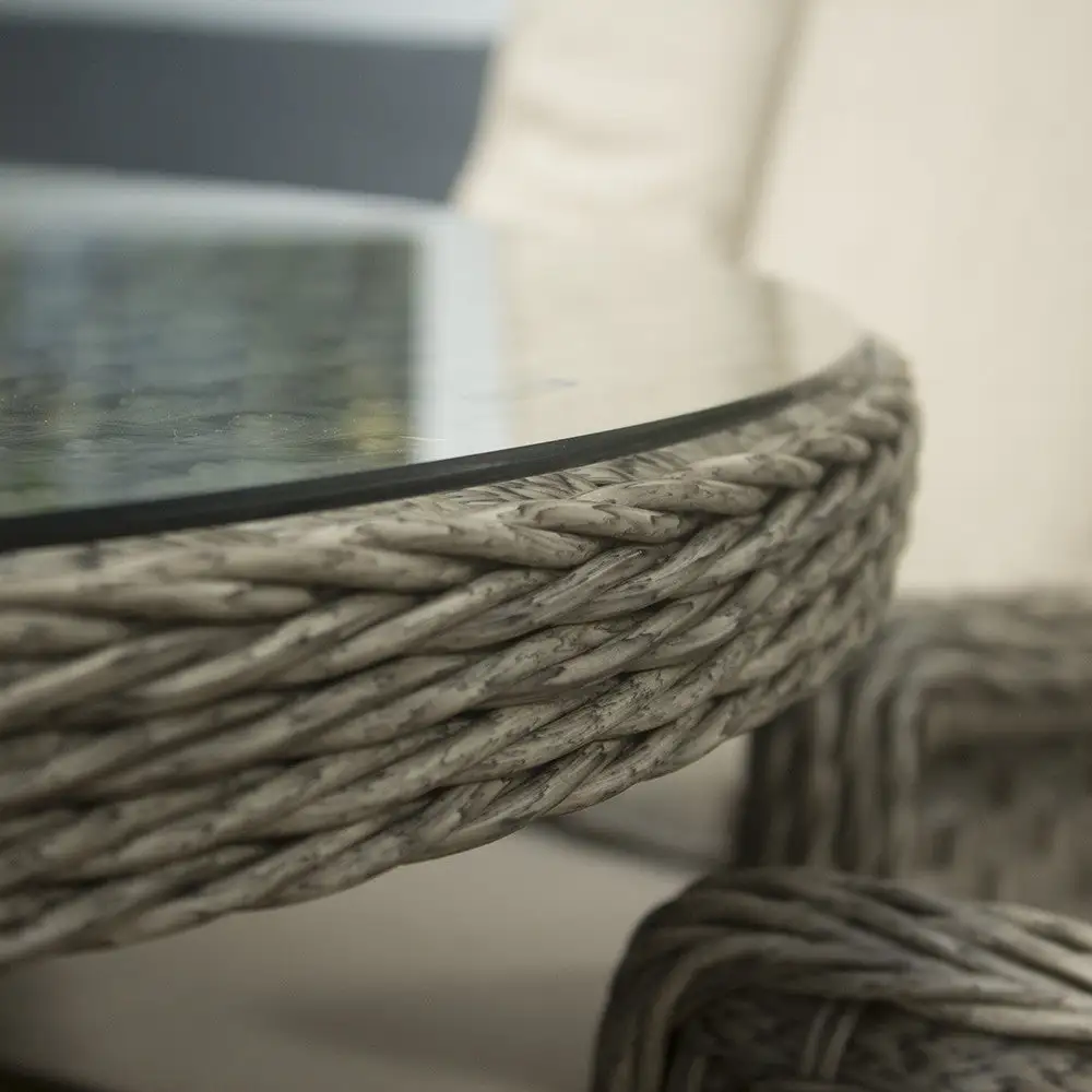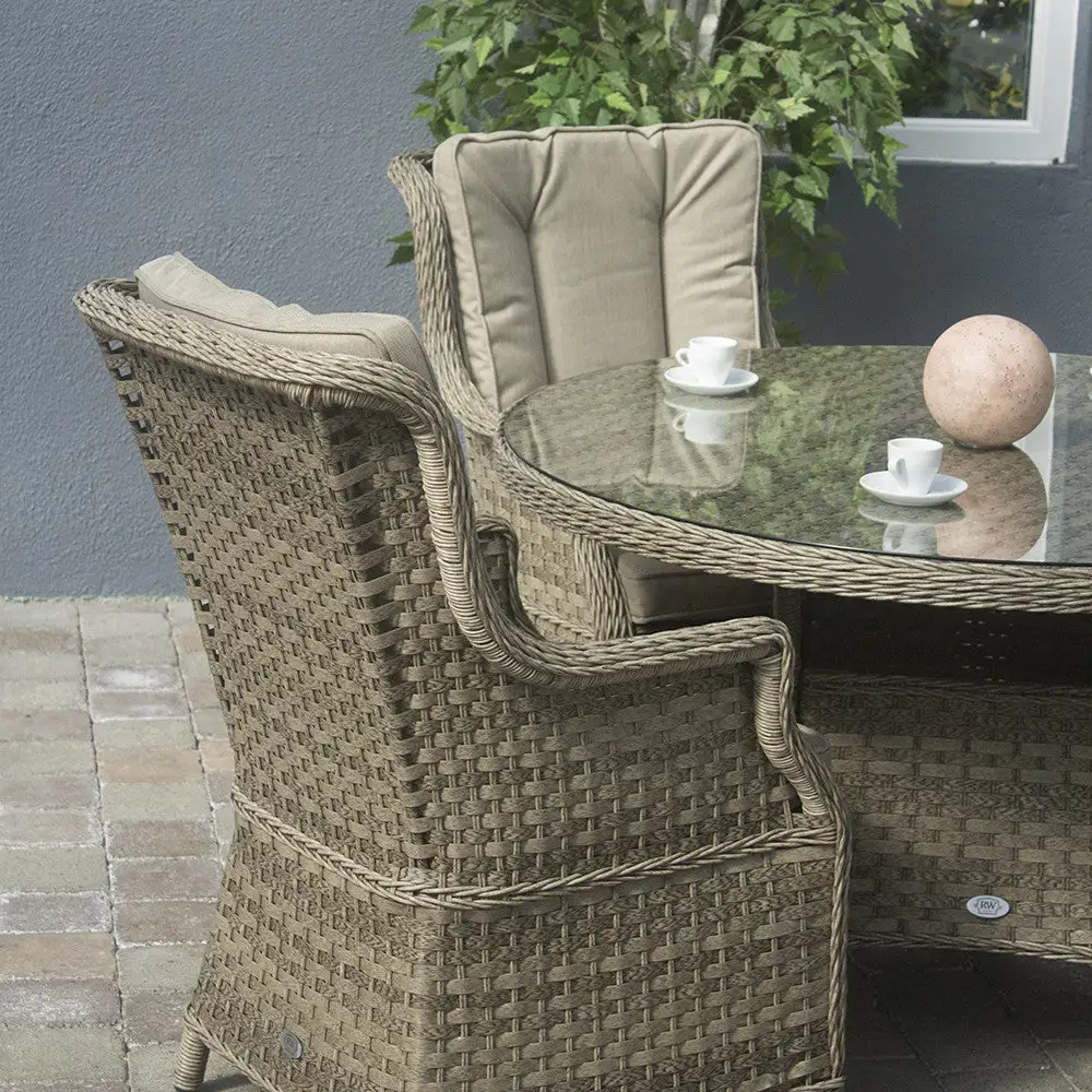 The Hampton ‘Alfresco’ range delivers exactly this and like all Rathwood Furniture, it’s designed with the best all-weather rattan, crafted from a high-quality synthetic weave with varied textures and tones woven around 1.2mm thick cast aluminium frames meaning this set will not rust and is fine to be left outdoors. The table top is made with rattan over a cast aluminium frame and for 2020 comes with a glass top made with 5mm tempered glass for safety. All cushions are easy to clean and made exclusively of the highest quality materials. There is little to no maintenance on this set making it the perfect addition to your home! It comes with a 5 Year Structural Guarantee but please note the glass is not covered by the guarantee. There is a minimal, straightforward assembly required.