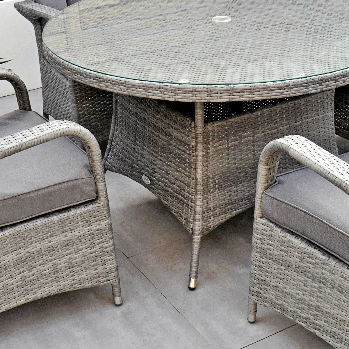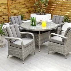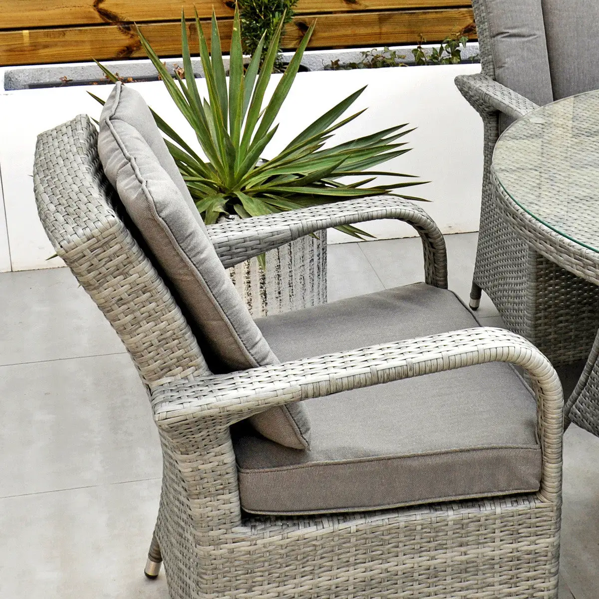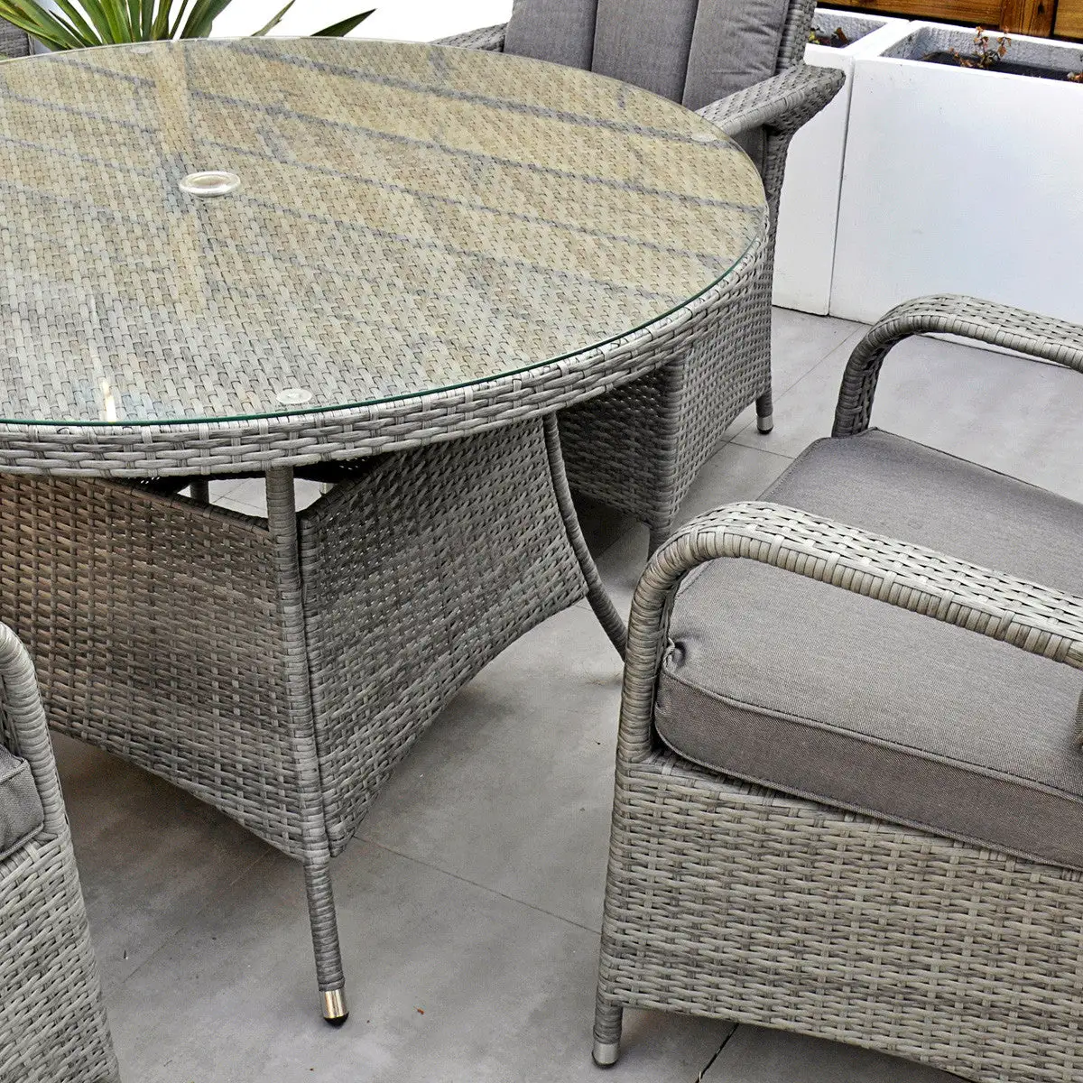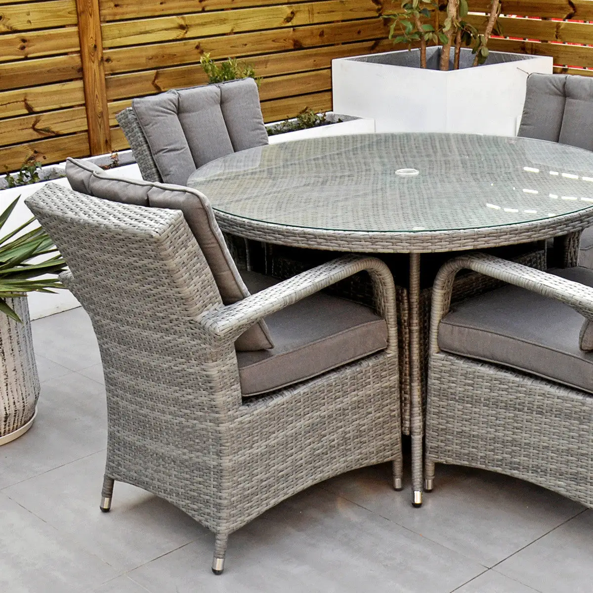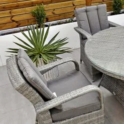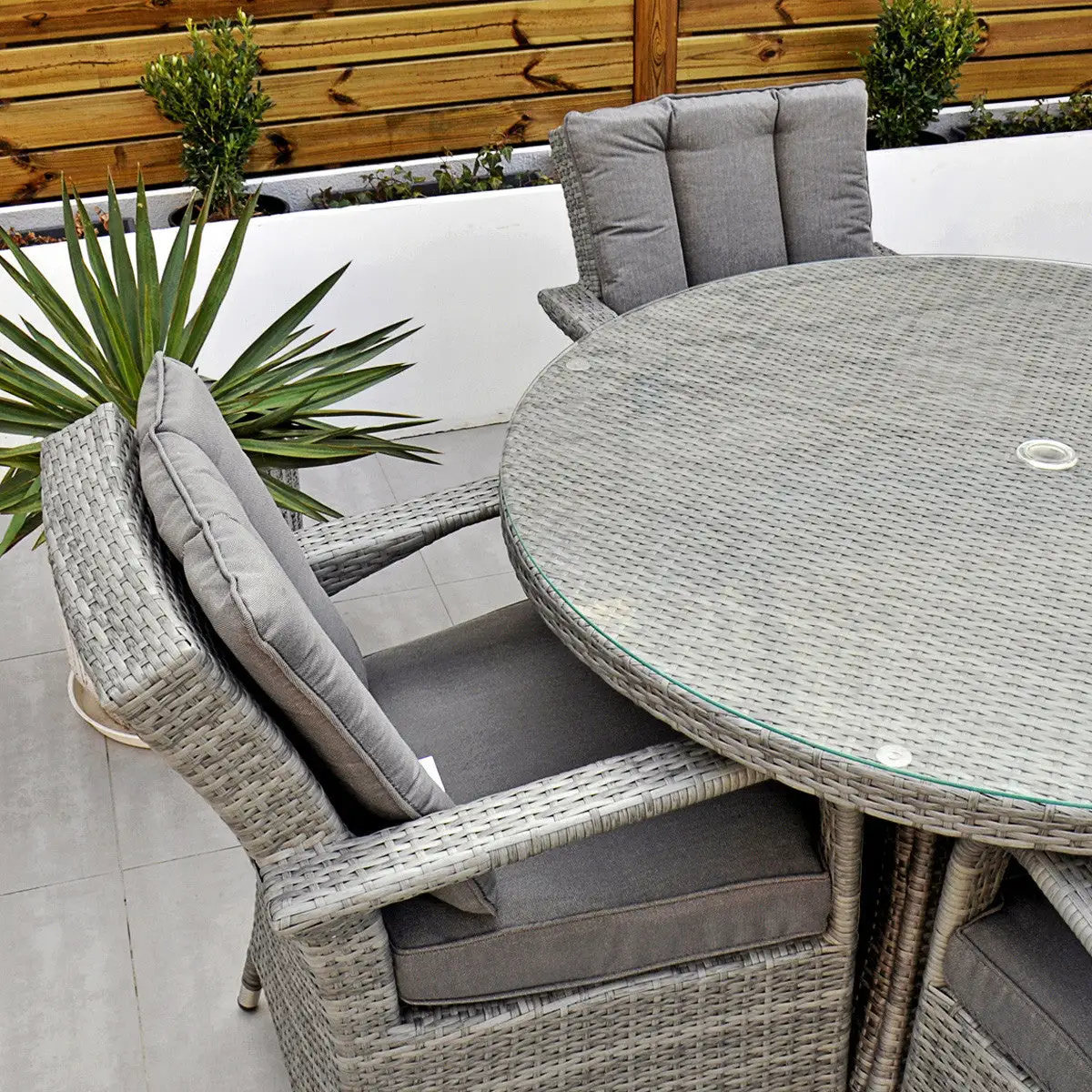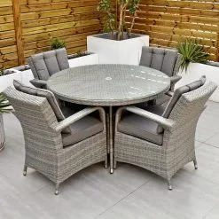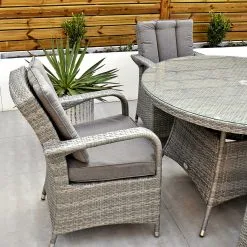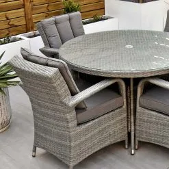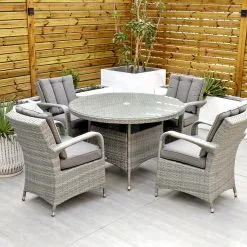 Like all Rathwood Furniture, it’s designed with the best all-weather rattan, crafted from a high-quality synthetic weave with varied textures and tones woven around 1.4mm thick cast aluminium frames meaning this set will not rust and is fine to be left outdoors. The glass table top is made with 5mm tempered glass for safety. All cushions are easy to clean and made exclusively of the highest quality UV-protected & weatherproof materials. There is little to no maintenance on this set making it the perfect addition to your home!