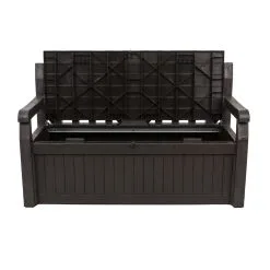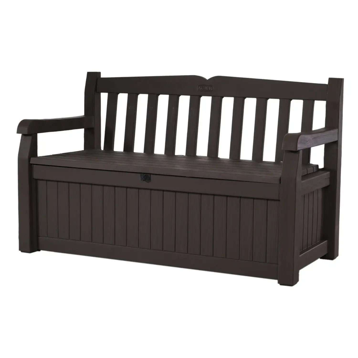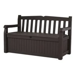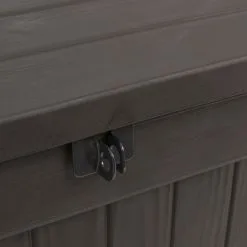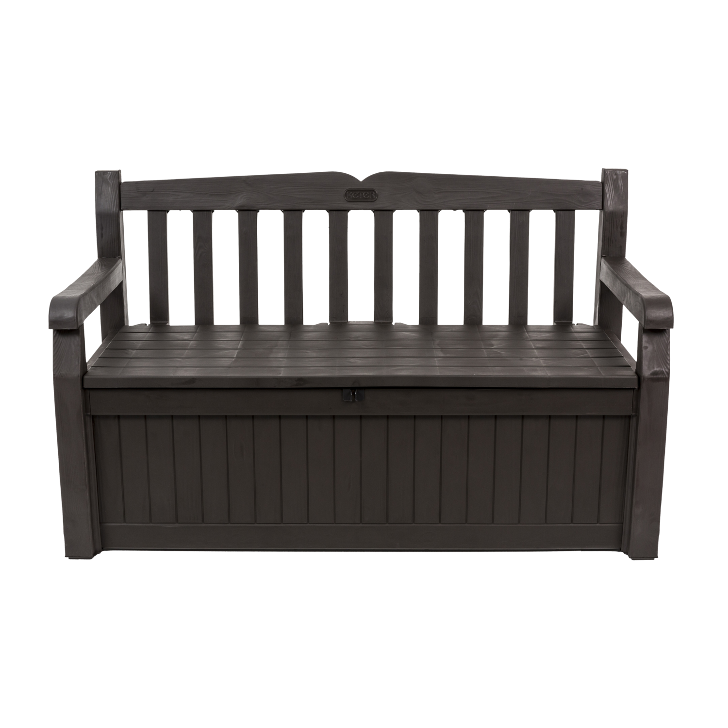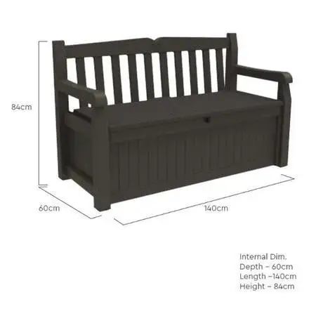 The Iceni Storage Bench with Wood Look. Functionality and modern design. The ideal place to store anything from toys to cushions. Keep your yard spotless all year long with this water-resistant storage box. Manufactured using Keter Resin which is 100% recyclable. Space-saving and practical storage solution for garden items