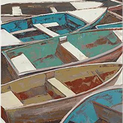 This is a mixed media art piece which shows boats at a fisherman wharf in bright colours.