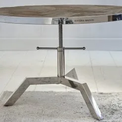The height of this coffee table can be adjusted to anywhere between 40 and 50 centimetres by twisting the top up or down. For an eyecatching effect, place multiple tables next to each other at different heights. The top is made of elm from old doors, and has a herringbone pattern and decorative stainless steel edging. The innovative frame is also stainless steel.