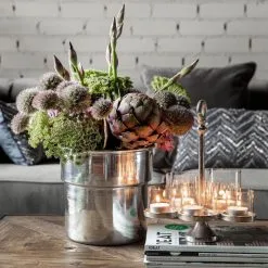 Different sized glasses give this tea light holder a playful character. In total, there are six glasses to hold separate tea lights. The glasses are connected in the shape of a triangle and you can move the tea light holder using the aluminium handle towering above the holder, without burning your fingers.