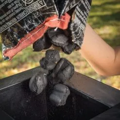 - GravityFedâ„¢ hopper holds 10 lbs. of lump charcoal or 16 lbs. of briquettes for 12-15 hours of use
