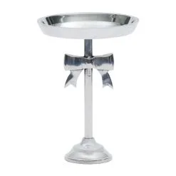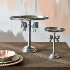 The large Classic Bow Cake Stand is a feast for the eyes on its own but looks even better with a cake displayed on it. The round silver cake stand is completely handcrafted of sturdy aluminium. The display tray is mounted on a tall pillar base decorated with beautiful bow. The unit stands some 21cm high. Also available in a large size standing 31cm high.