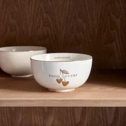 The Food Lovers Bowl with a diameter of 14 centimetres is the more spacious bowl in the Food Lovers range. The white porcelain bowl has a golden edge and a golden decoration of two interconnected hearts and also features golden letters that spell: ‘Food Lovers’. This tableware is manufactured by hand, and therefore each item is unique.