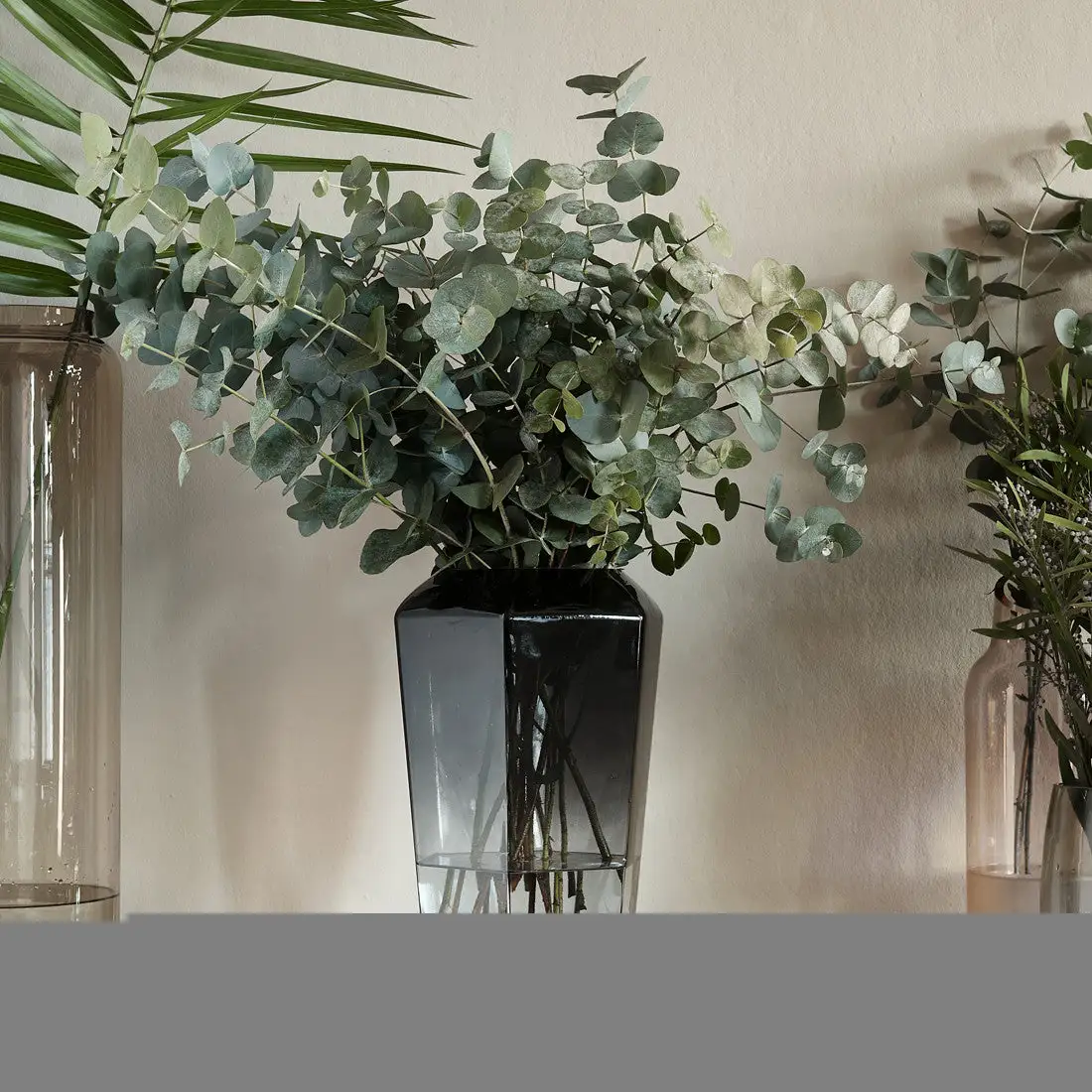 The glass of this vase is shaped like a hexagon and features a colour gradient from completely transparent to smoky grey. With its wide neck and 38 centimetres height the vase is suitable for your larger bouquets.