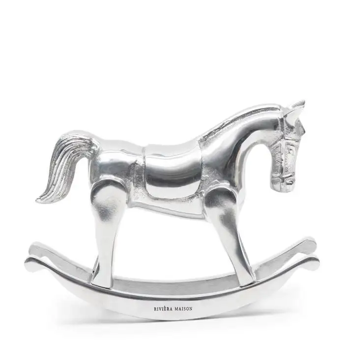 Rocking horse made of durable, soft shiny aluminum. Who hasn’t ridden a horse like this before? Nice decoration in memory of days gone by, or to embellish the children’s room. You can’t really play with it, but you can wiggle it, manually. Complete with RM branding.