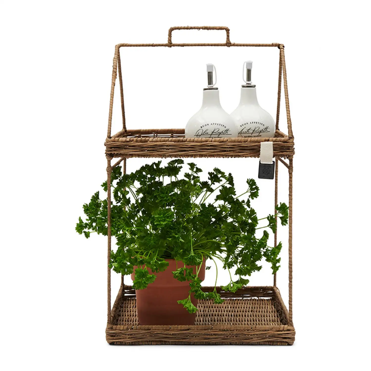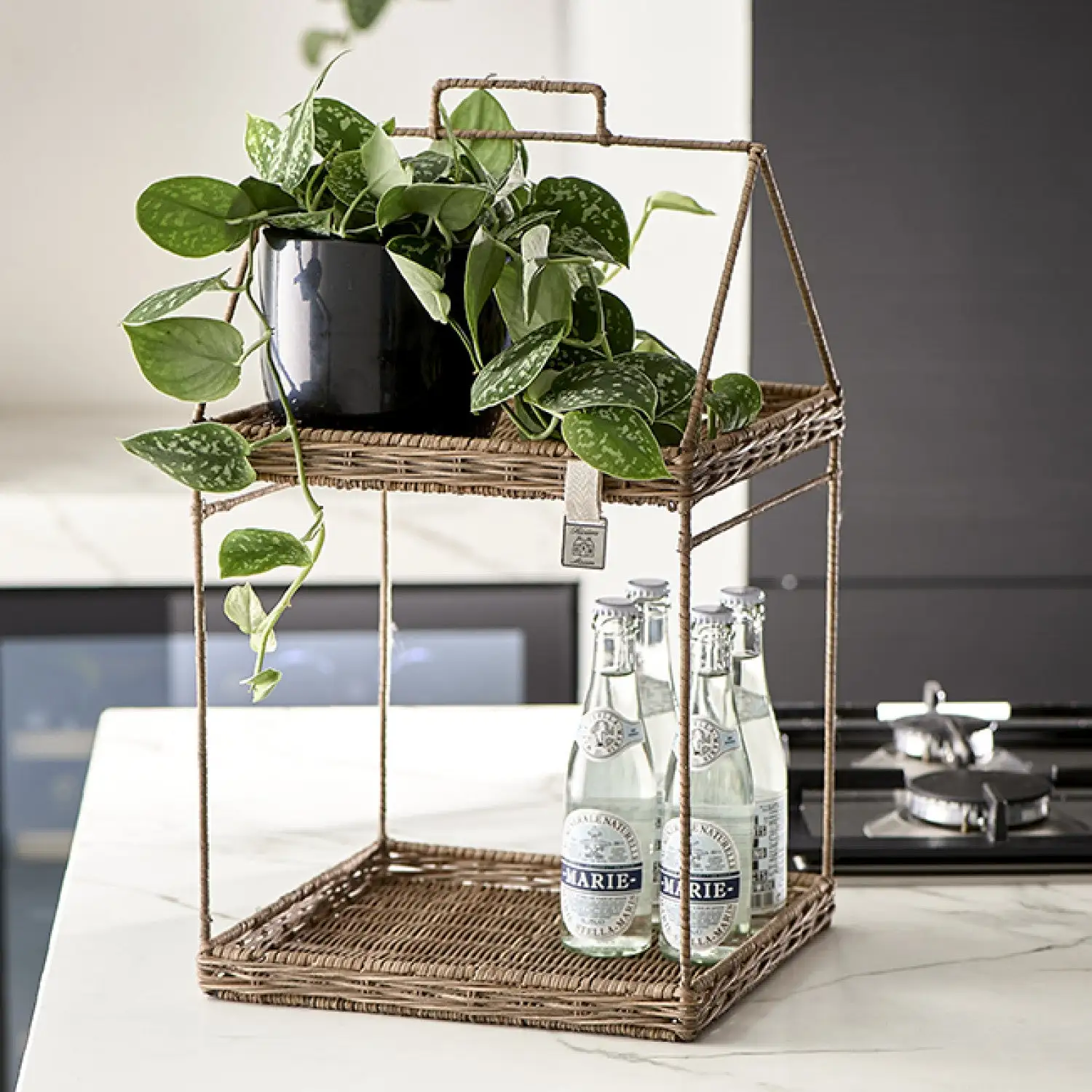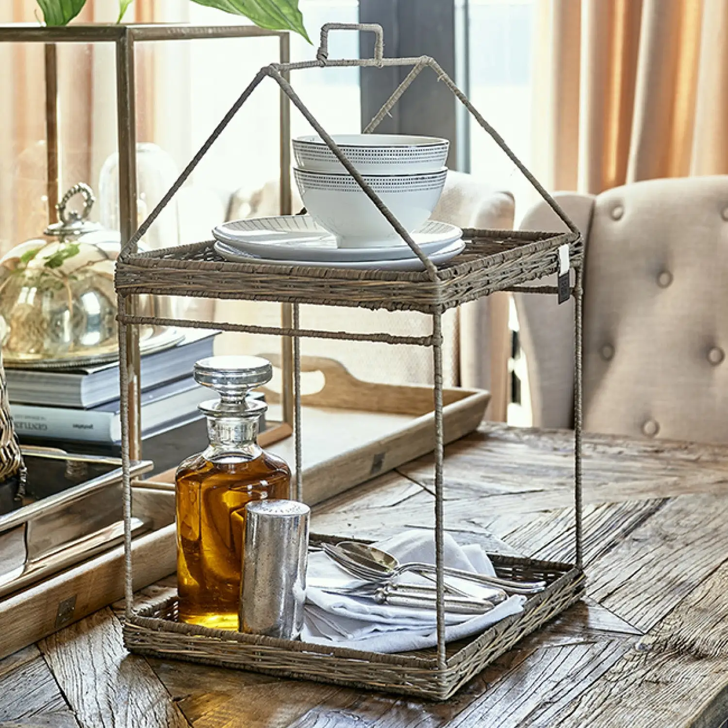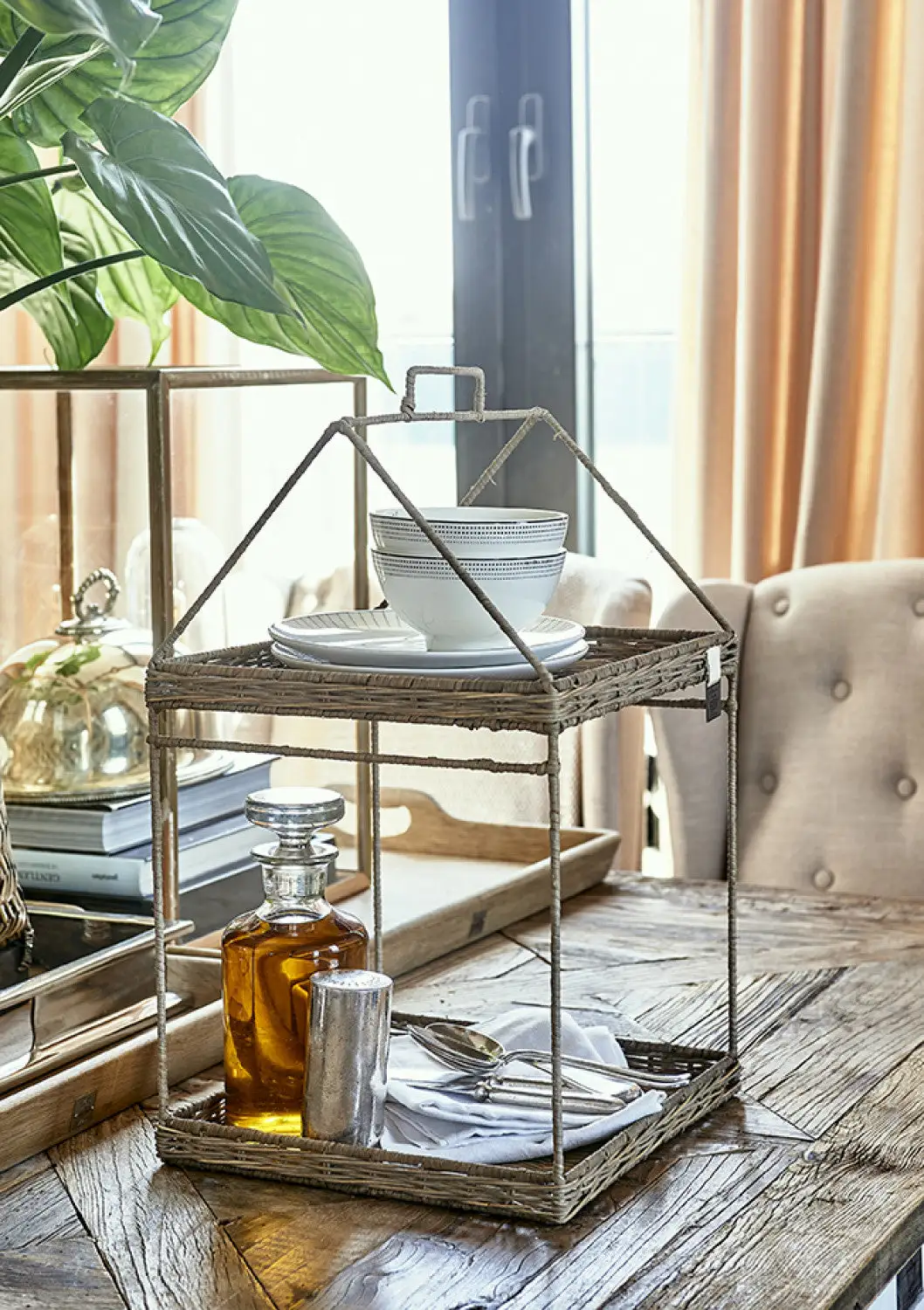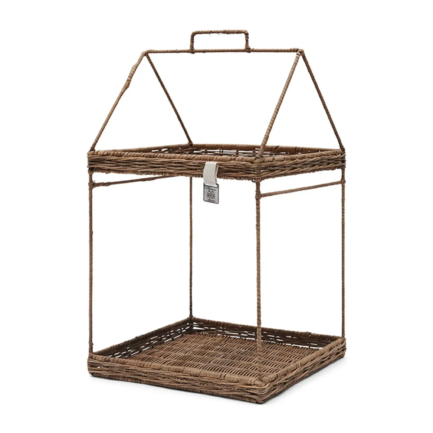 This double square serving tray made of rustic rattan has plenty of space for delicacies or decorative items. Thanks to its use of a natural material and house-shaped design, it has a warm, appealing look.