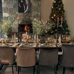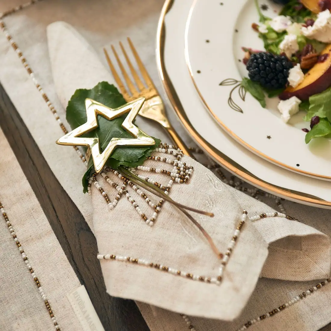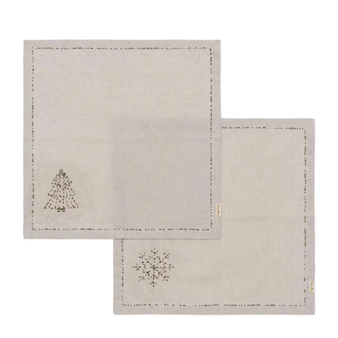 Two gorgeous Christmas napkins of beautifully woven linen and a super delicate embroidery of tiny beads… A Christmas star or tree in the top left corner and a rim of the same beads. With white yarn and a Christmas wish. Breathes craftsmanship. Matching placemats are available. The napkins are square.