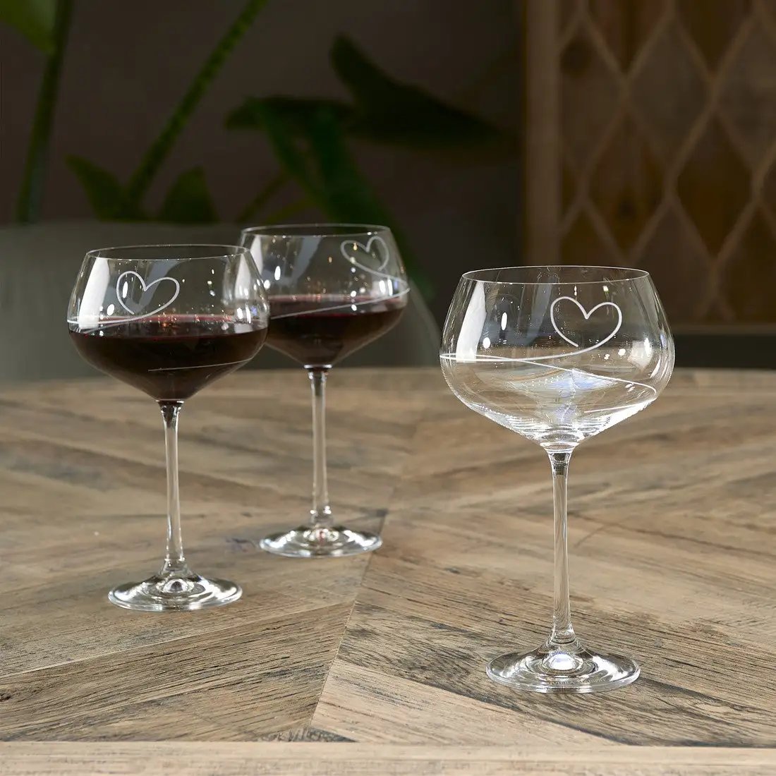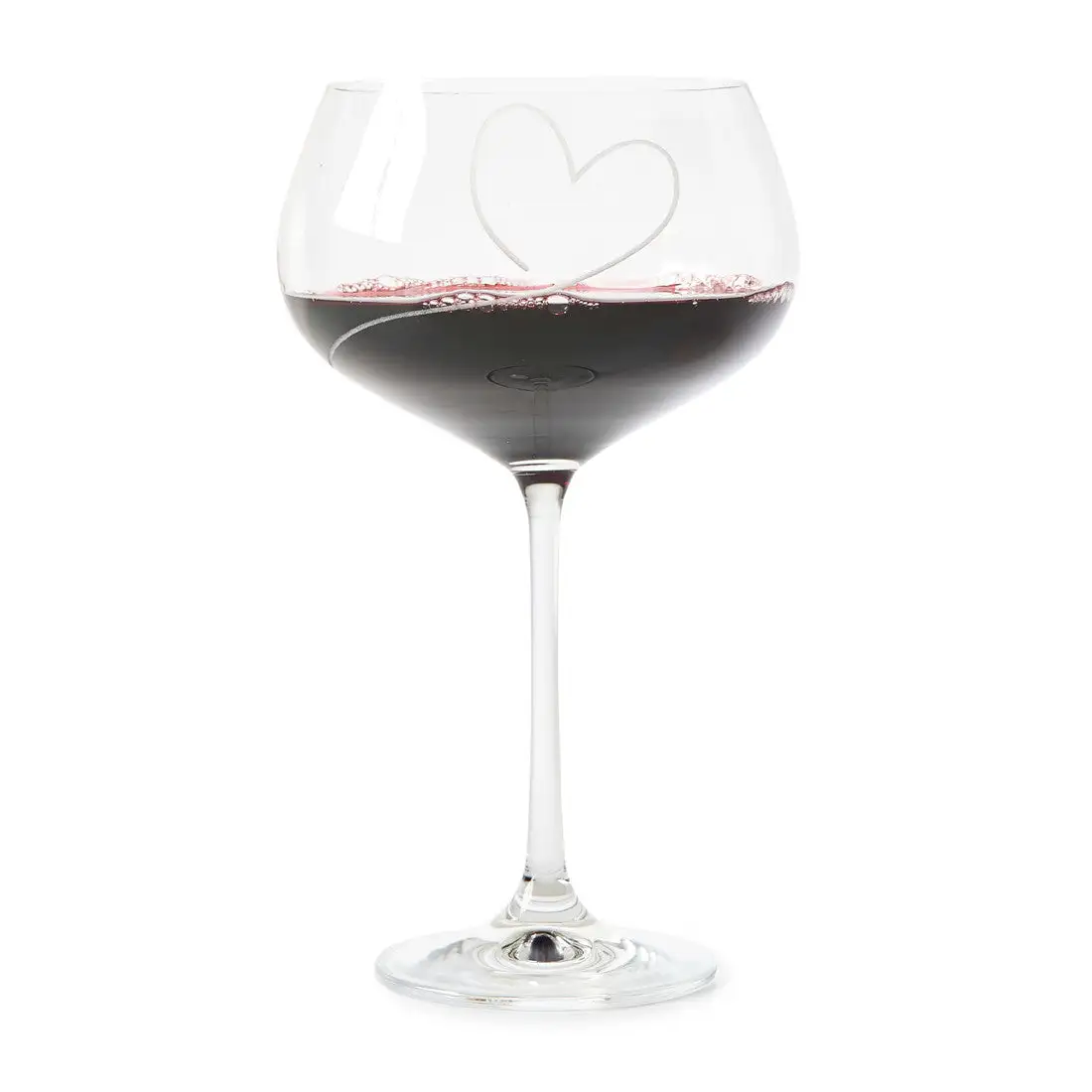 This is a mouth blown glass with a playful heart hand painted on the bowl so truly made with love. It is in a classic red wine glass shape, perfect for sipping your favourite vintage.