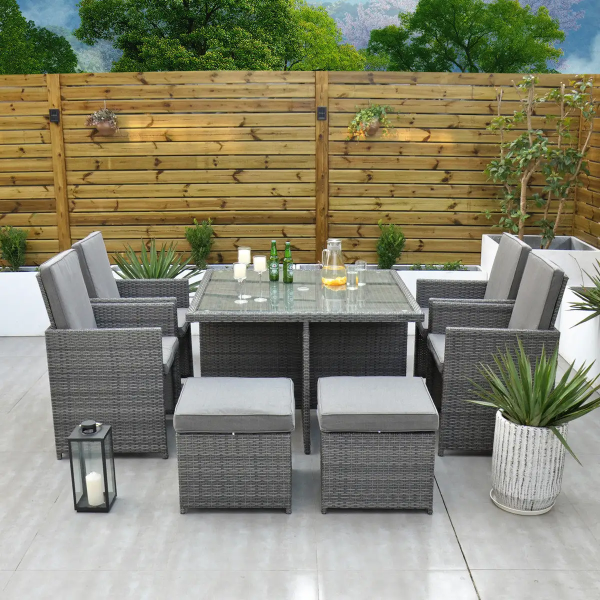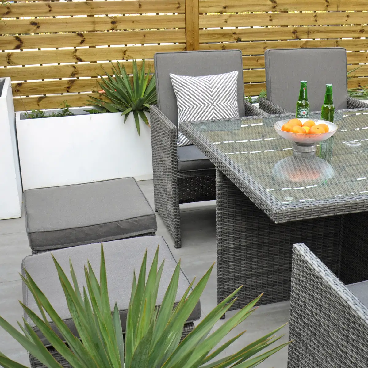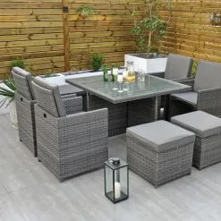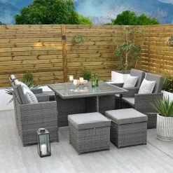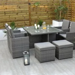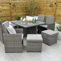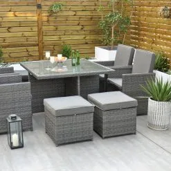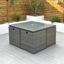 The clever design of the Ottawa – 4 Seat Cube Set makes it perfect if you are confined to space in your garden area. Initially a 4 Seat, it turns into an 8 Seat if needed with the 4 footstools, under each seat, being used as ottomans or simply use them as footstools if you want to sit back and relax during that sunny summers evening.