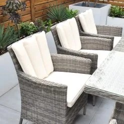 Like all Rathwood Furniture, it’s designed with the best all-weather rattan, crafted from a high-quality natural weave with varied textures and tones woven around 1.4mm thick cast aluminium frames meaning this set will not rust and is fine to be left outdoors. The table top is made of 5mm tempered glass for safety. All cushions are easy to clean and made exclusively of the highest quality UV-protected & weatherproof materials. There is little to no maintenance on this set making it the perfect addition to your home! It comes with a 5-Year Structural Guarantee but please note the glass is not covered by the guarantee. There is a minimal, straightforward assembly required.