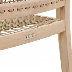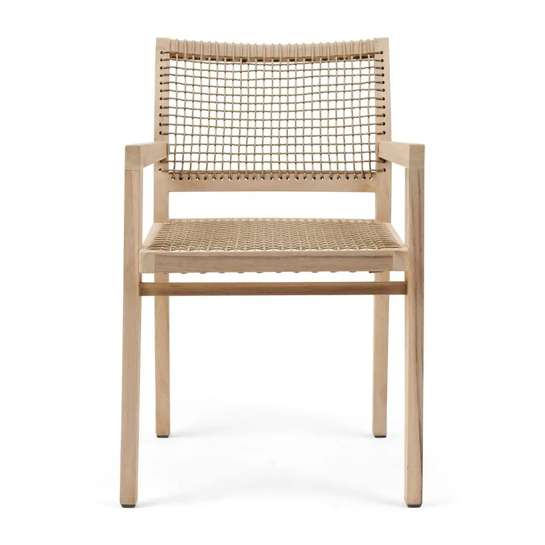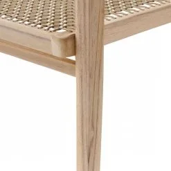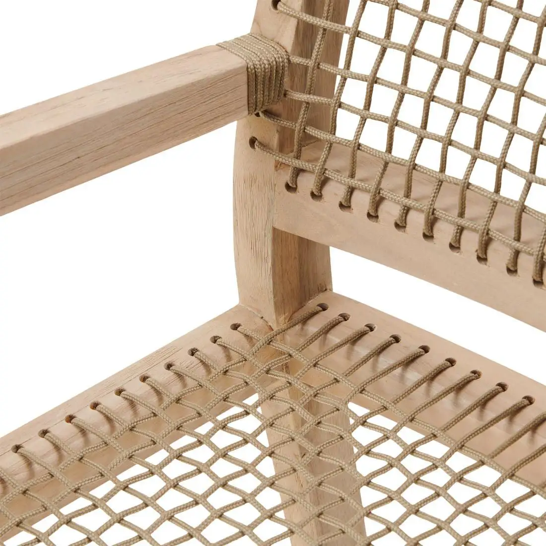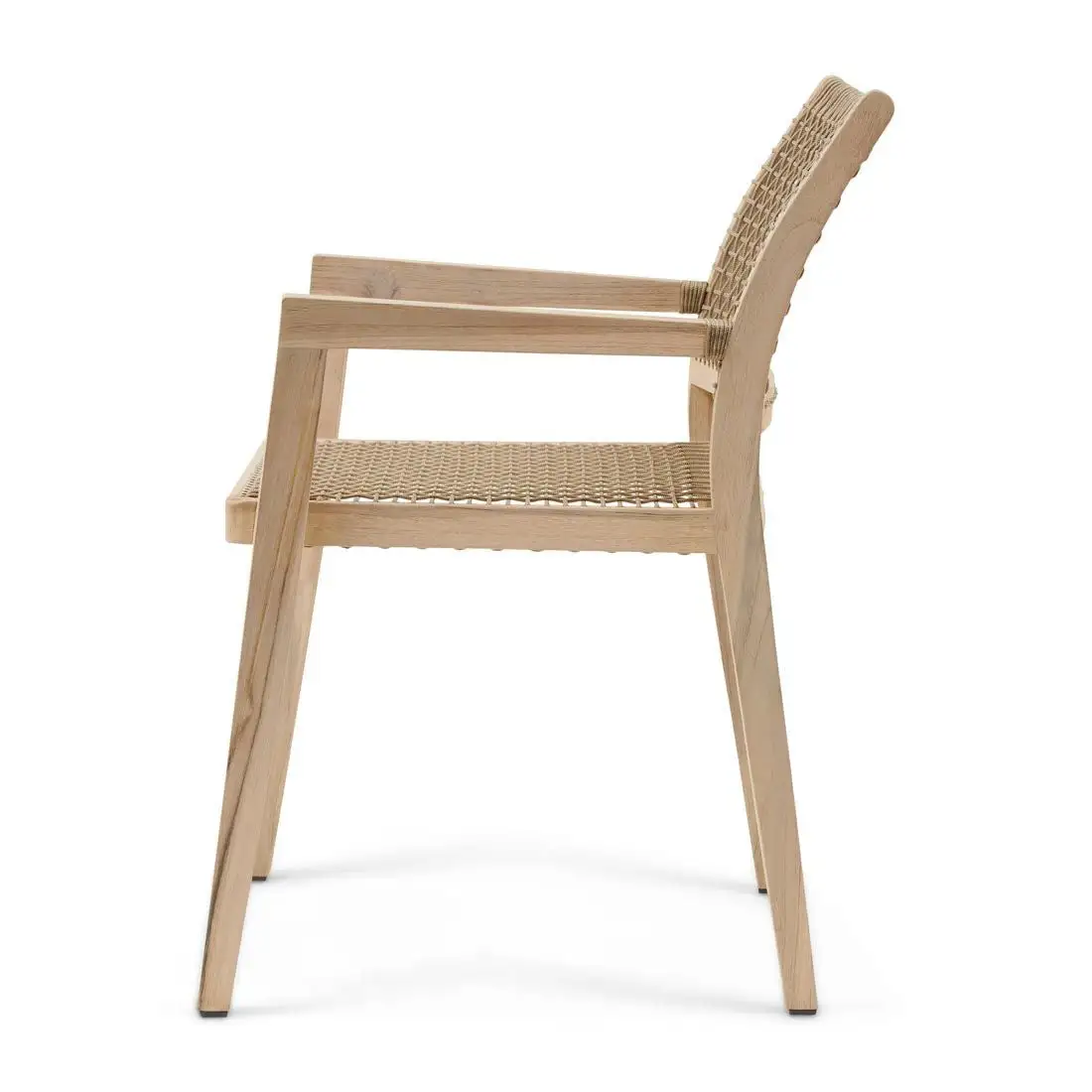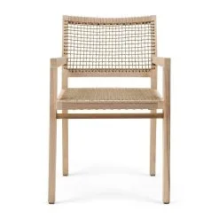 A formal-looking dining armchair designed for outdoor use but would not look out of place indoors either. The frame is made from responsibly cut teak which is proven to be excellent in outdoor settings and the seat and gently curved back are finished with a lattice of rope wonderfully braided by hand giving seating comfort as well as allowing a cooling airflow.