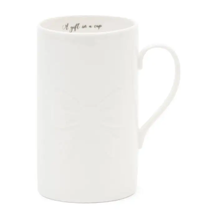 This mug of gorgeous white ceramic is a great gift and addition to your collection of mugs, cups and glasses. The mug features a handle, a large relief shaped like a bow on the front and a subtle text ‘a gift in a cup’ on the inside. Available in various sizes.
