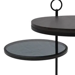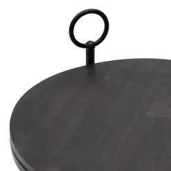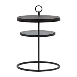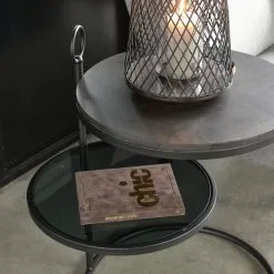 The Bella Side Table is a round side table. The table top is made of mango wood with a dark stain and underneath this wooden top, you’ll find a second, swivelling table top of hardened glass. A convenient way to create more space for a snack, drink or simply for a decoration. The frame is made of iron.