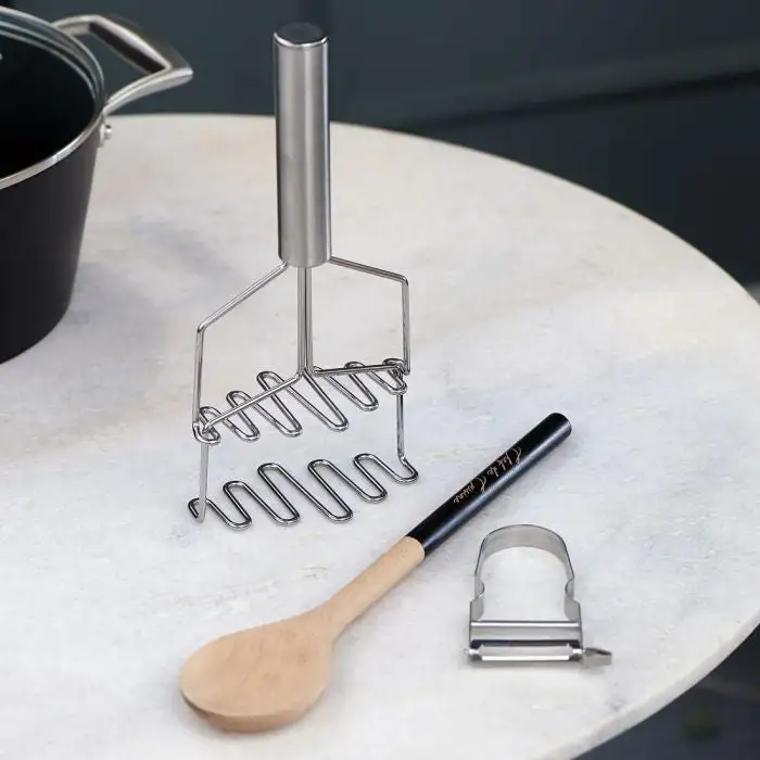 Whether you like a winter stew or a summer dish with a tasty puree, with the Chef De Cuisine Mashed Potatoe set you have everything you need to prepare (potato) puree. For example, the set contains an extra large pestle, a peeler and a wooden ladle with black handle. The set comes in a beautiful gift box.