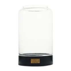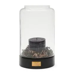 A glass windlight on a wooden base. The two can be separated, so the glass can also be used as a vase, but a bold candle with some decorative dried leaves and flowers looks just as nice. With gold RM Amsterdam plate.