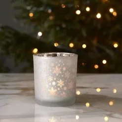 Light a candle in the Classic Christmas candle holder and dream away with sparkling snow crystals. The tea light holder is made of glass, which is matt white on the outside and glossy on the inside. A pattern of snowflakes has been incorporated into the glass. Available in different sizes and designs.