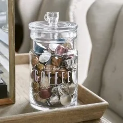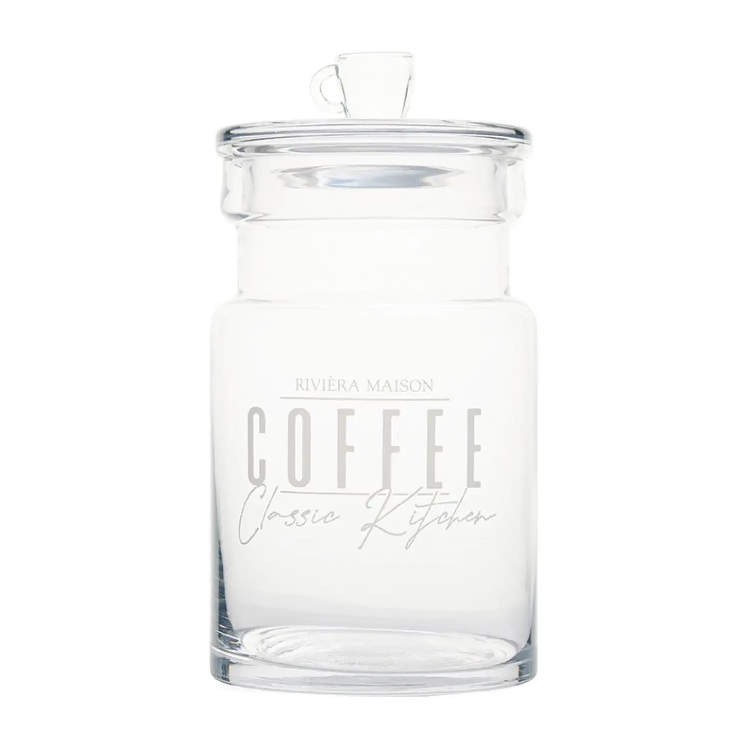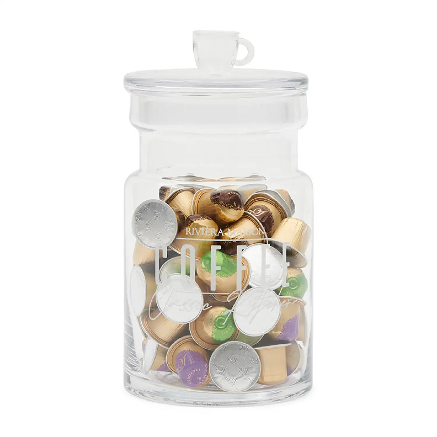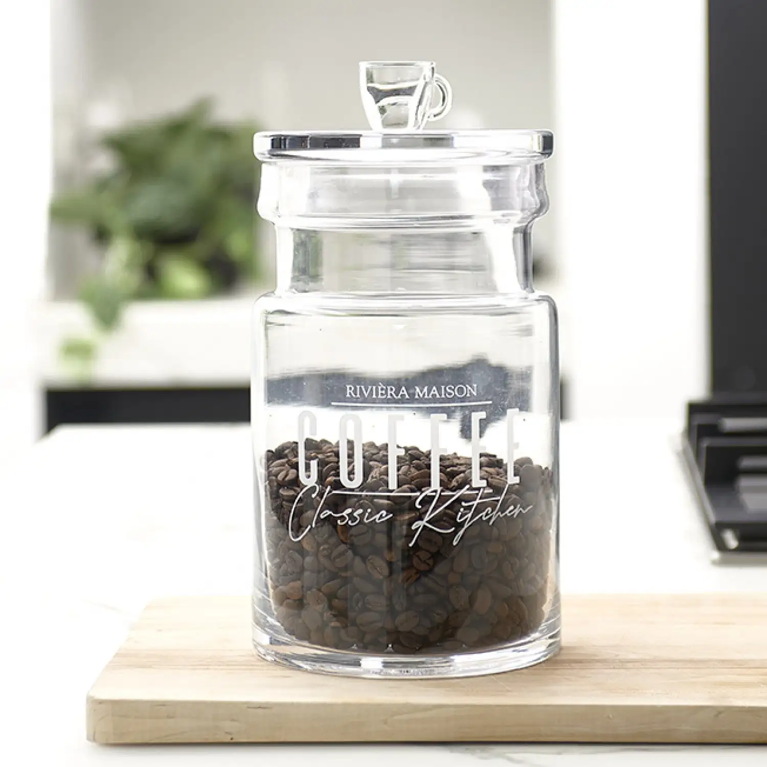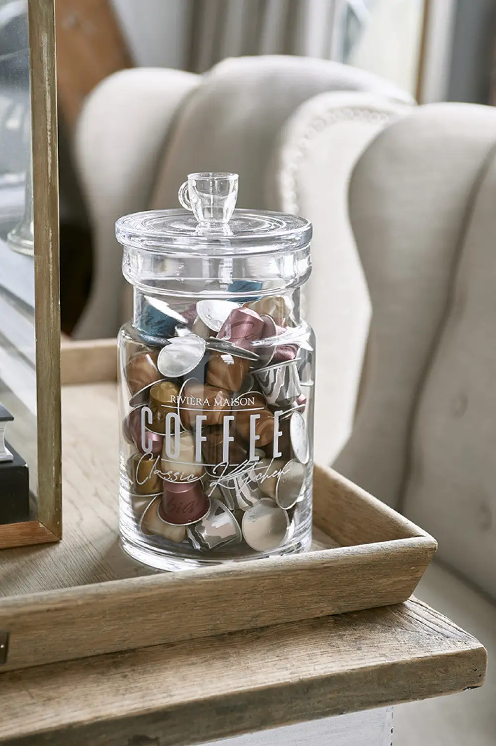 Storage jars are indispensable in the kitchen. This medium version is made entirely of glass, and the glass coffee cup on the lid suggests storing coffee beans or pods. Available in various versions.