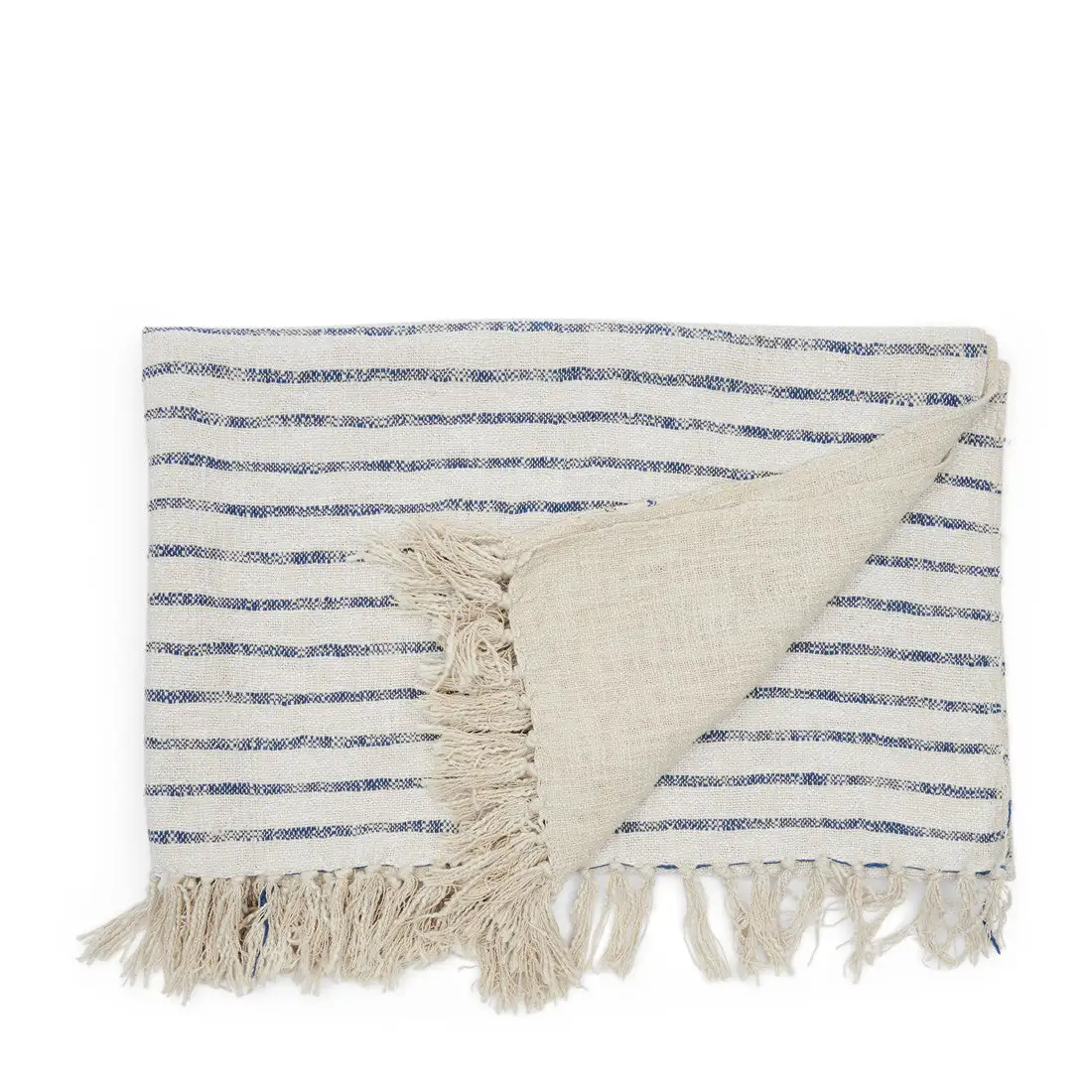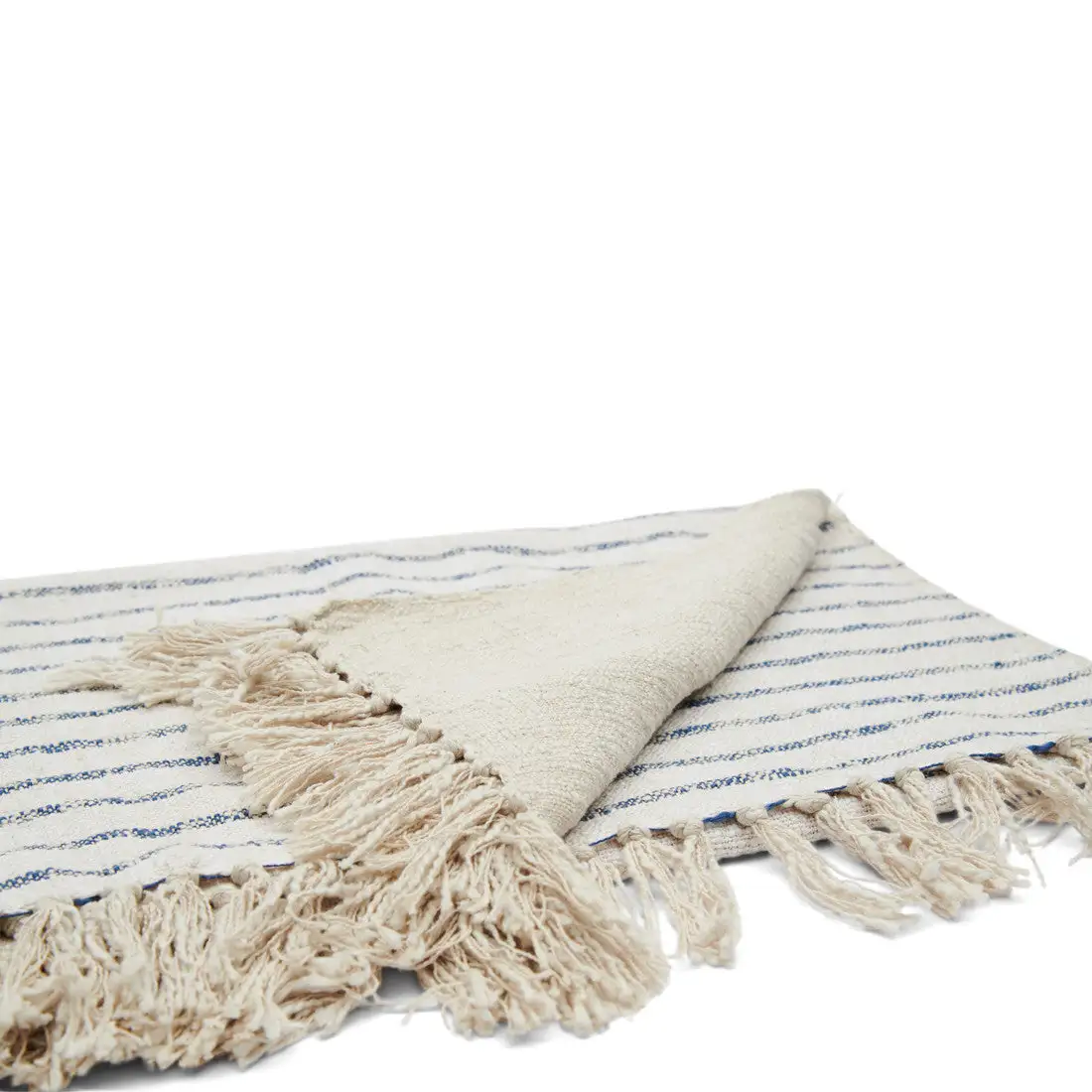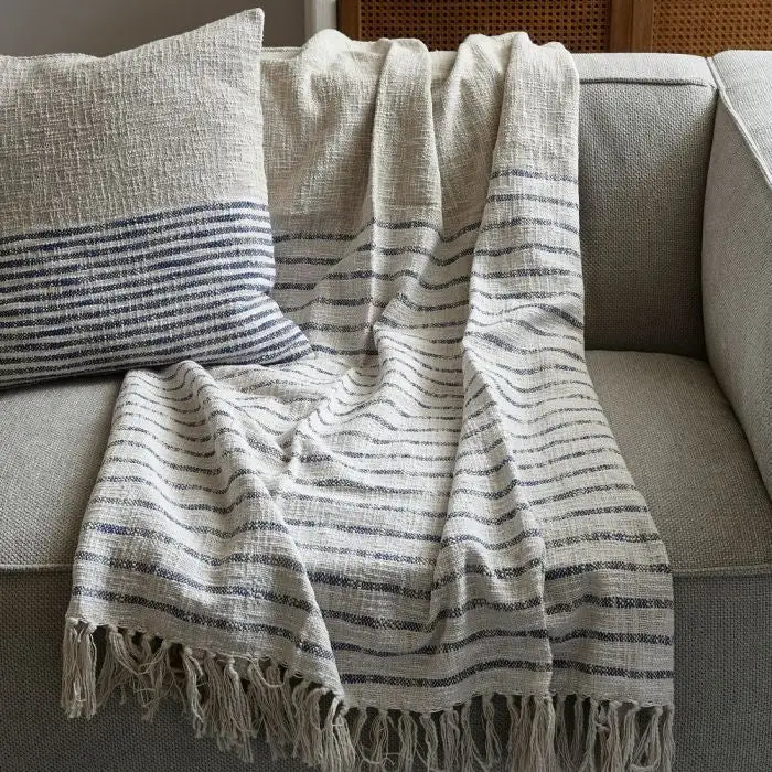 This cotton throw features alternating blue and beige stripes on one half, while the other half is executed in plain beige. This throw comes in a coarse weave that makes it seem like the entire thing consists of tiny knots. Cotton tassels elegantly decorate the short sides.