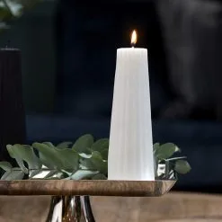 With its off-white colour, this cone-shaped candle with a vertical rib structure is a beautiful source of light and warmth. The white velvet finish gives the candle a matte finish. For extra stability, always place the candle on a saucer or shelf. This also prevents candle wax from dripping onto the surface.