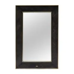 This mirror has a frame of dark oak and a hand-inlaid herringbone pattern, combined with gold-coloured stainless steel.