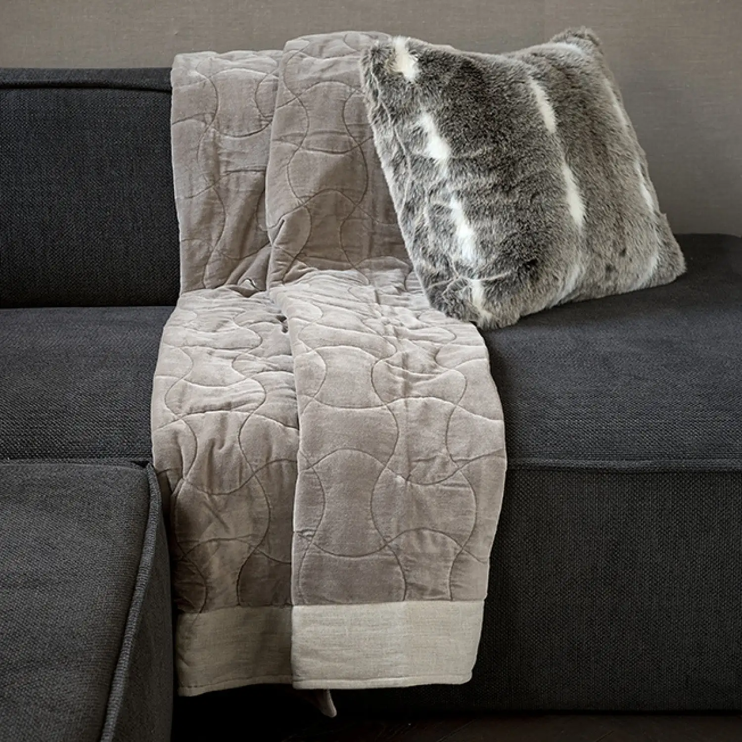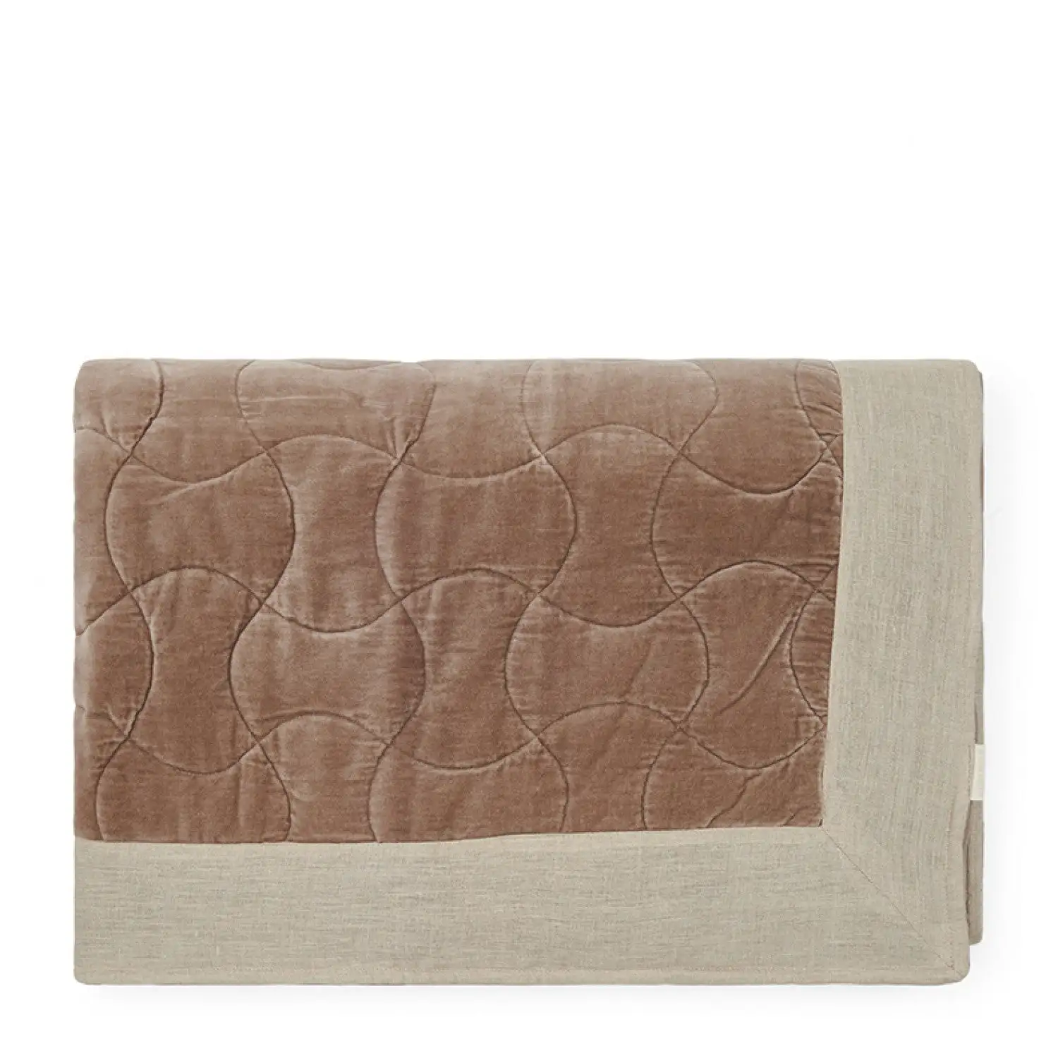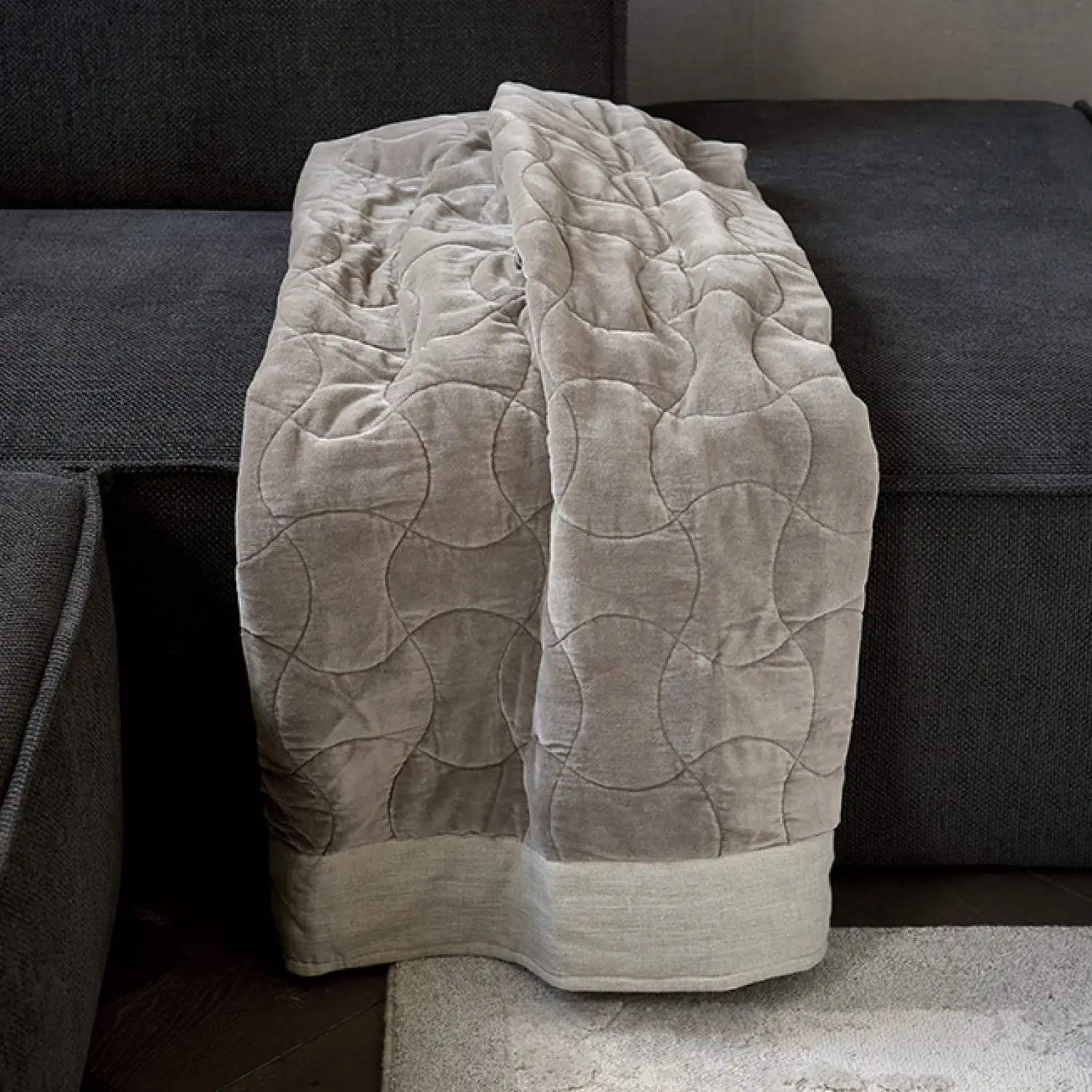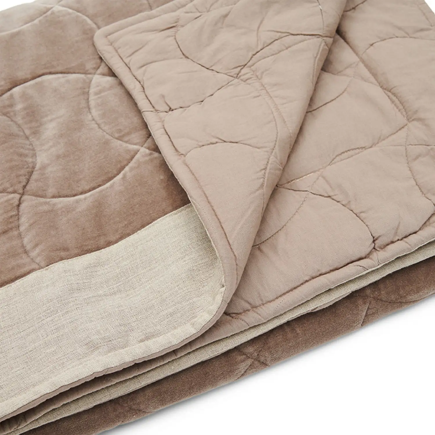 This padded living blanket made of velvet invites you to wrap yourself up in it. The soft fabric, warm fawn colour and graceful round stitching all radiate a feeling of warmth. The wide piping is made from a combination of cotton and linen, and the reverse is breathable cotton.
