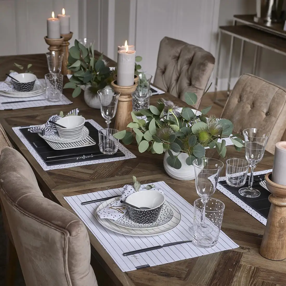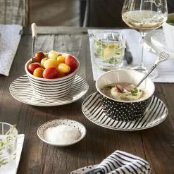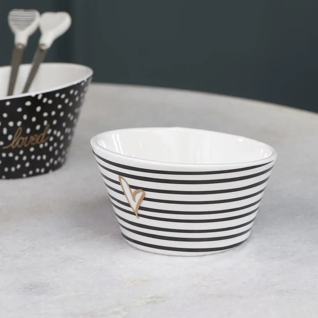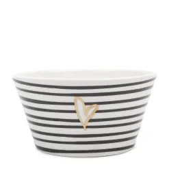The Dots & Stripes Heart Bowl is a white bowl with a playful print of black stripes. A playful golden heart can also be seen on the outside. Other tableware is also available within this series, with which you can mix and match to your heart’s content.