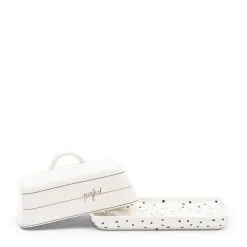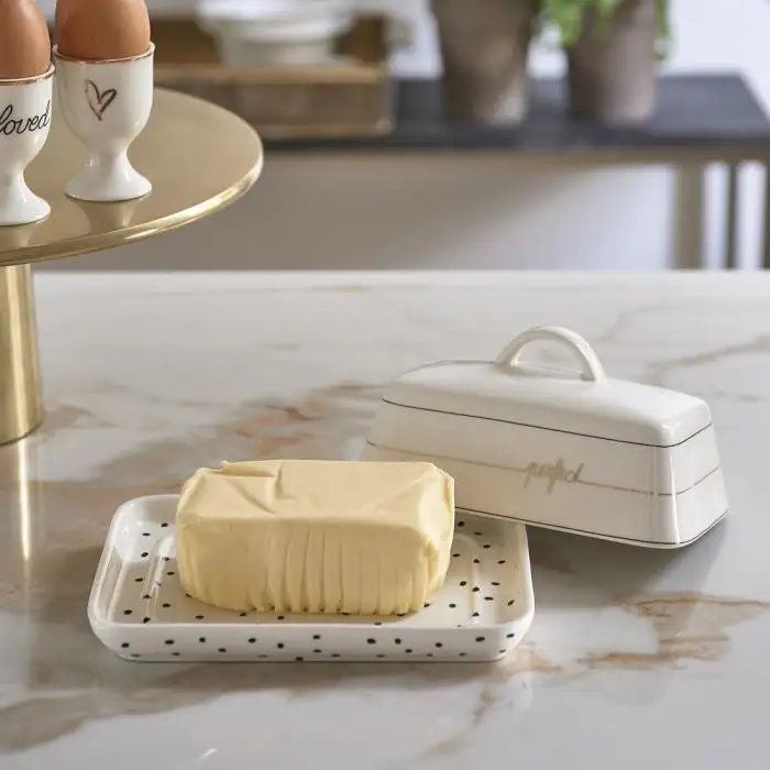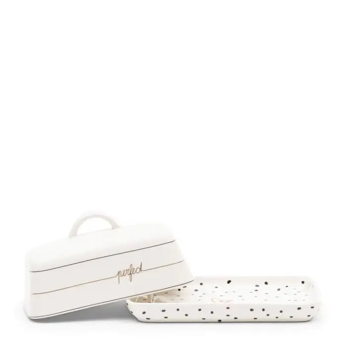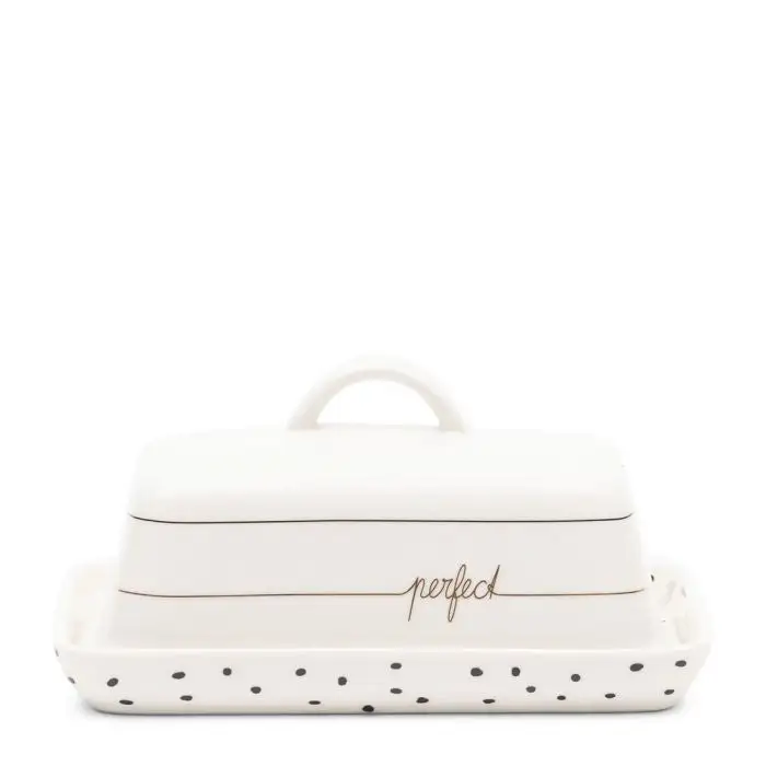 The Dots & Stripes Perfect Butter Dish is made of white porcelain. The butter dish from the Dots & Stripes tableware series features black and golden details, including black dots, stripes and the word ‘perfect’ printed in gold. Match the butter dish with other items from this series.