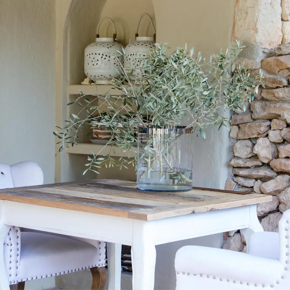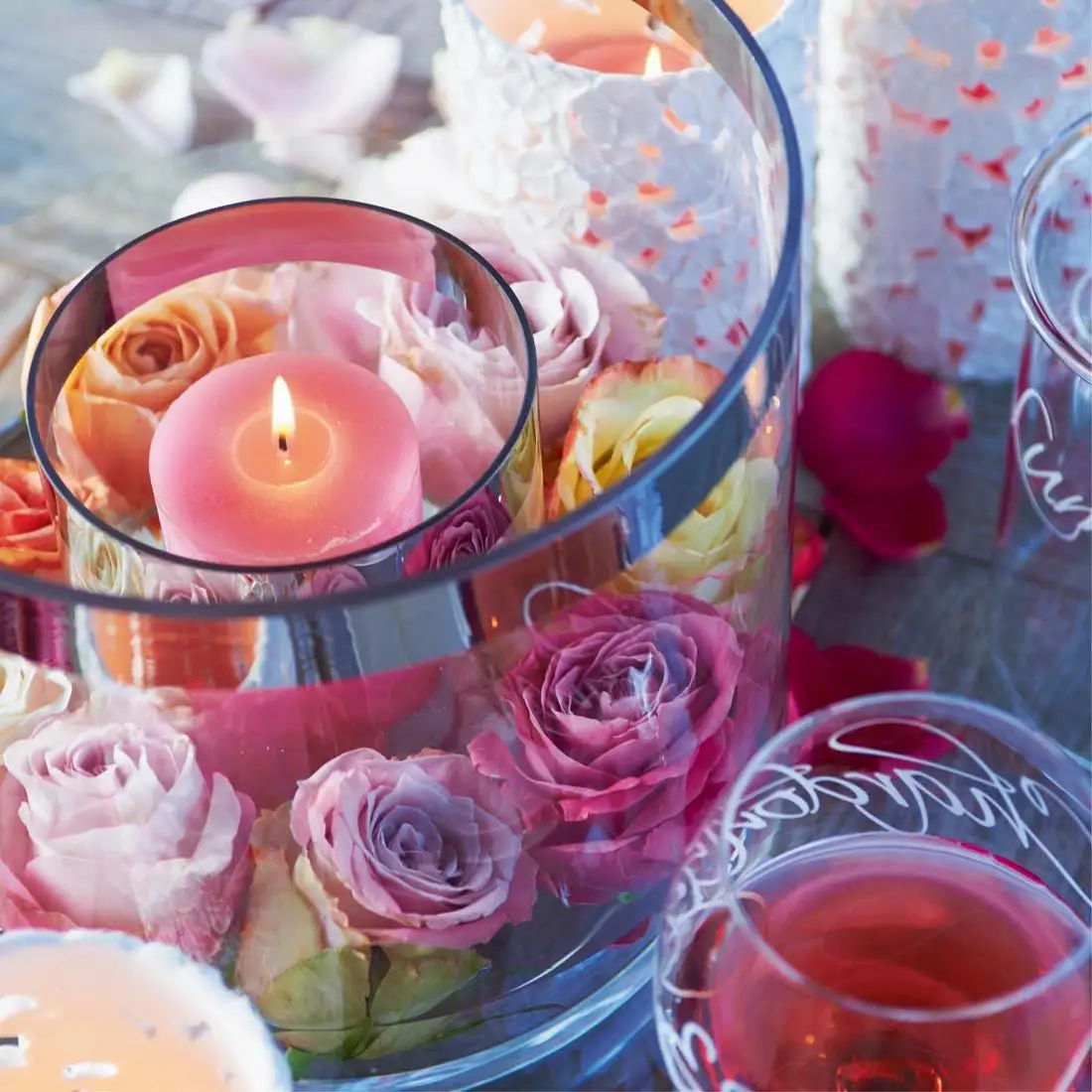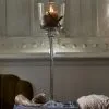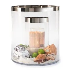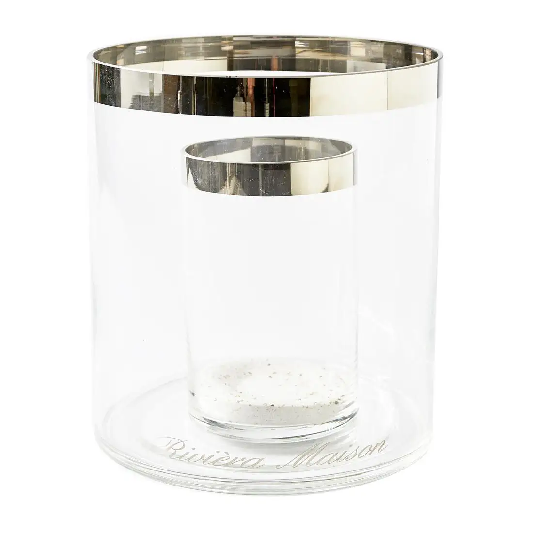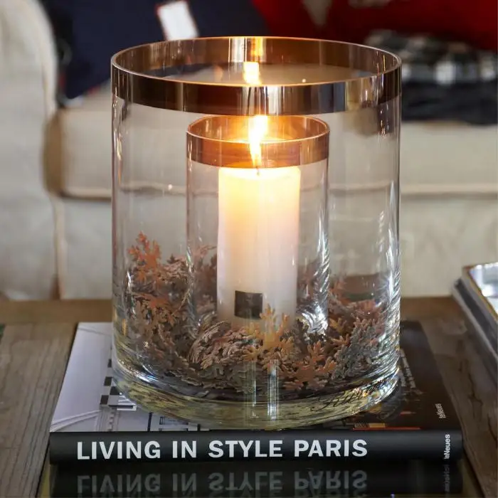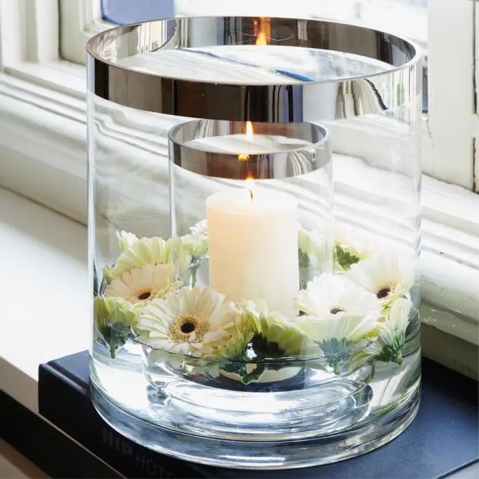 A double-walled hurricane lamp. The space between the two cylinders is handy for varying the decoration. You can use shells and sand in the summer time, small bonbons for High Tea or water and real floating flowers.