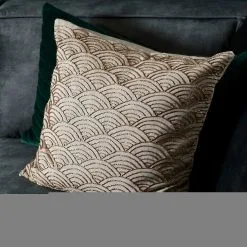 The Enchanting Beaded cushion is made from cotton fabric with of thousands of little tubular gold beads hand-threaded onto it, one by one in arcs, creating a graphic pattern. The inner cushion is not included.