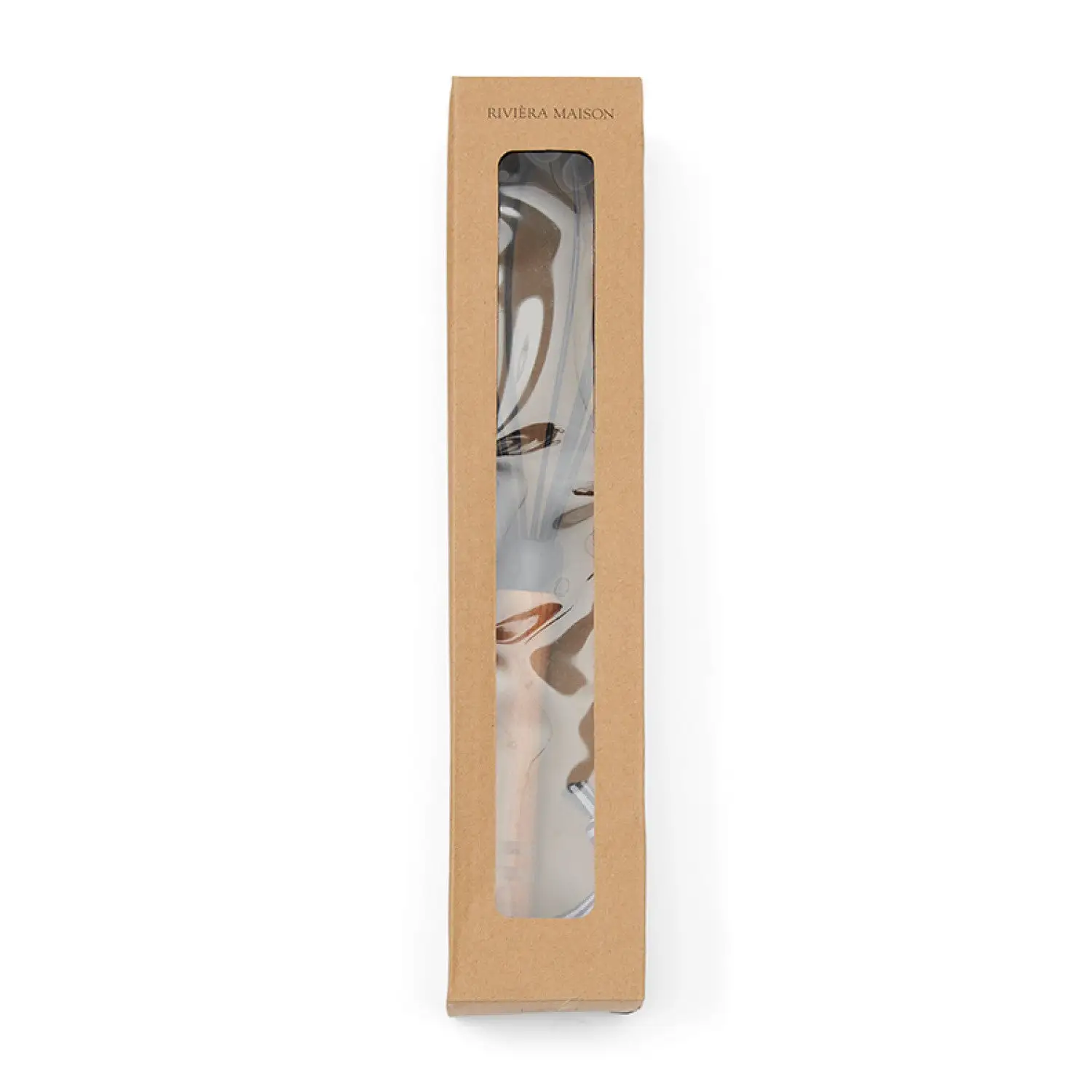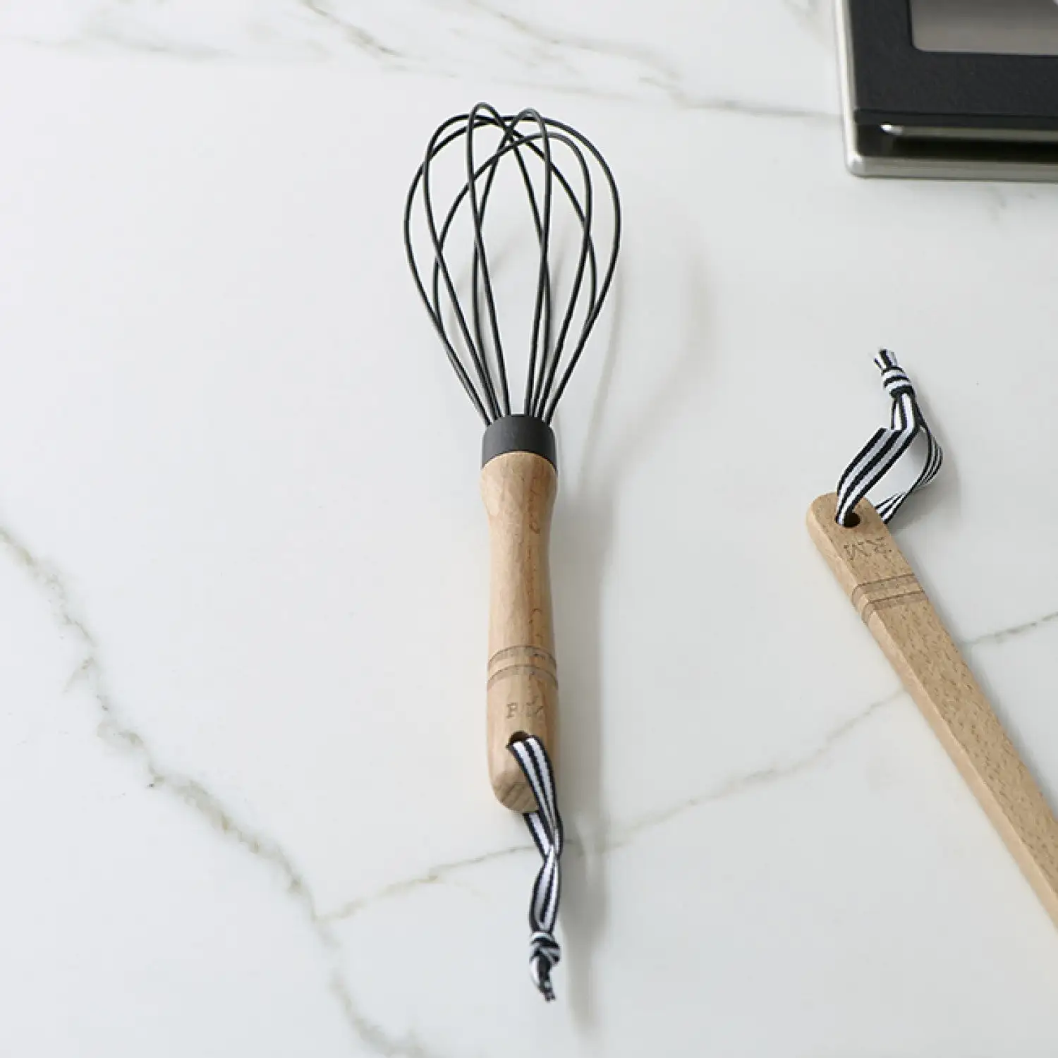 A whisk is an indispensable accessory for the amateur chef or home baker. This one is made of black silicone with a wooden handle, and has a ribbon to hang it by. It comes in a gift box.
